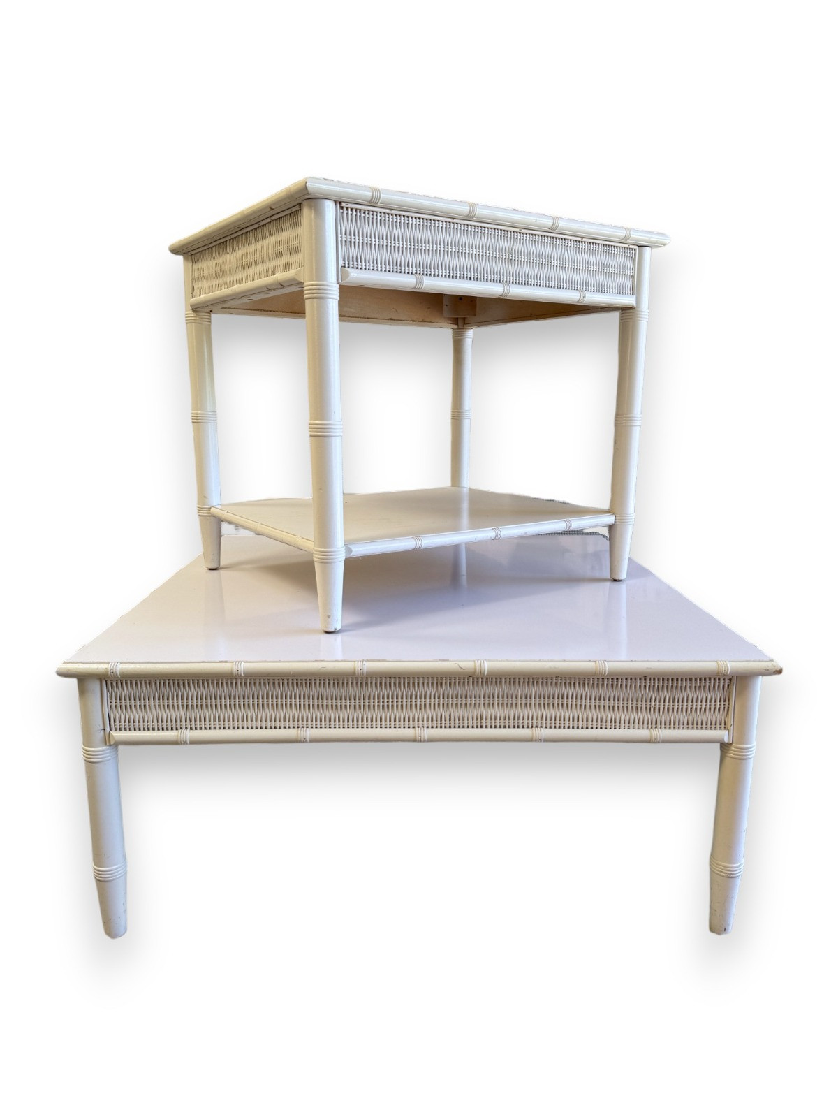 Lot # 4 - Vintage USA Made Solid Wood, Wicker, & Laminate Coffee & Side Tables