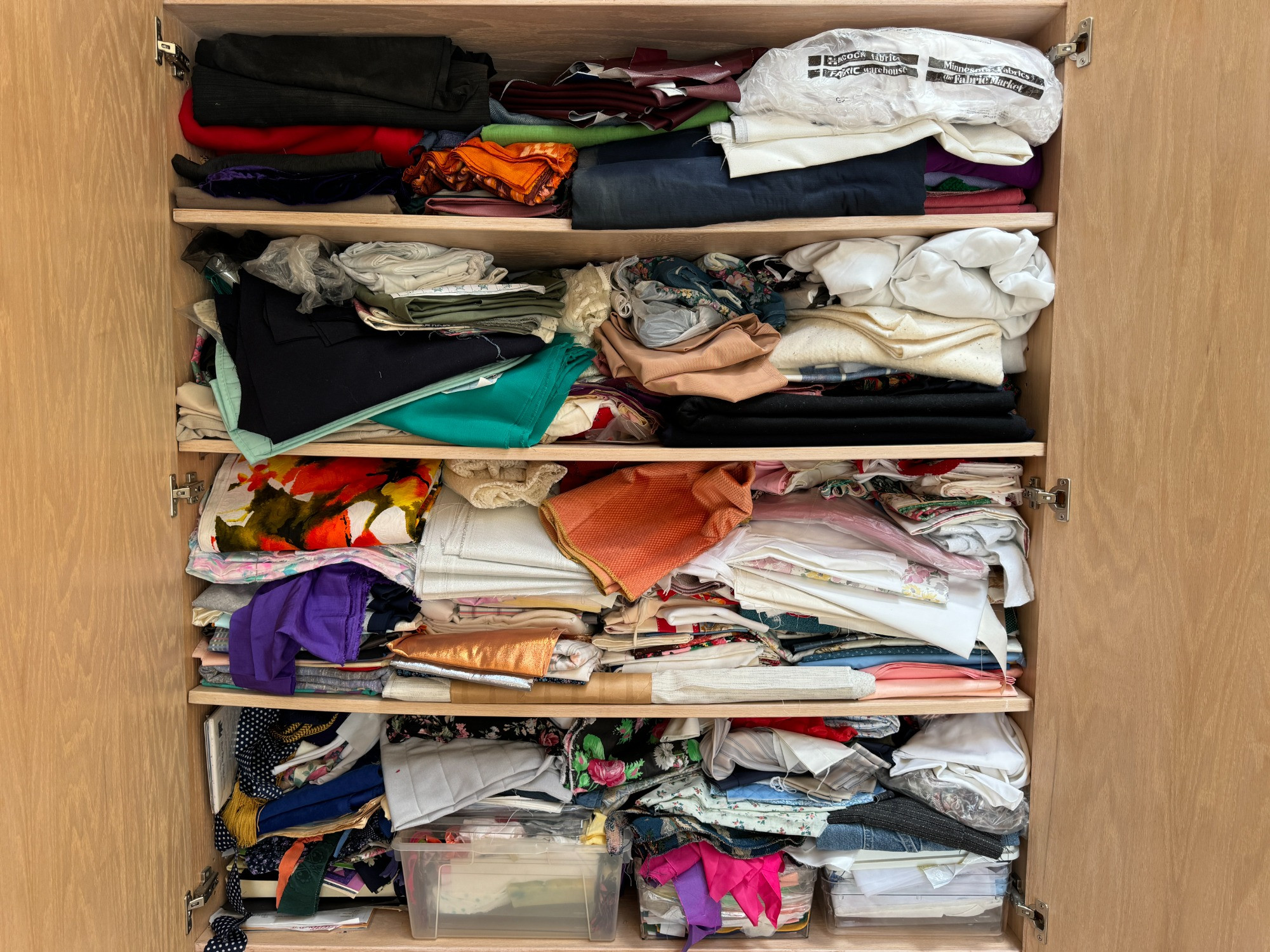 Due to the sheer quantity of items... **YOU MUST HAVE A PICK UP TIME OF NO LATER THAN 12pm on DAY OF PICKUPS** **YOU MUST TAKE ALL THE ITEMS** Bring lots of bags/bins, a friend (or two?!) and a roomy vehicle. This is years of fabric. Well cared for and in a variety of patterns and materials. Dimensions of the space these are located in - 46" x 50.5" x 16" deep