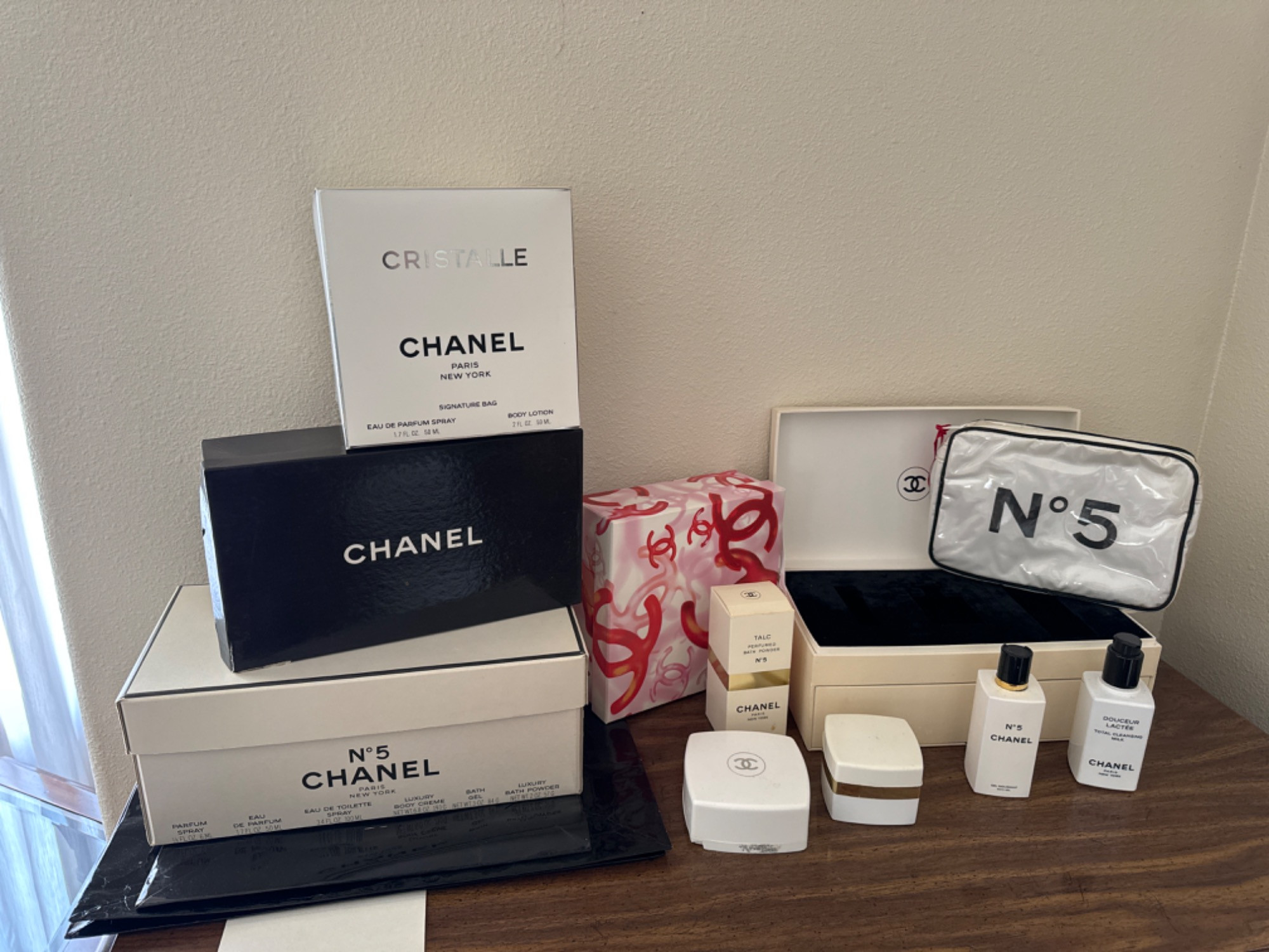 Chanel Boxes, Bags, & New Chanel No 5 Unused Powder Talc powders appear unused.