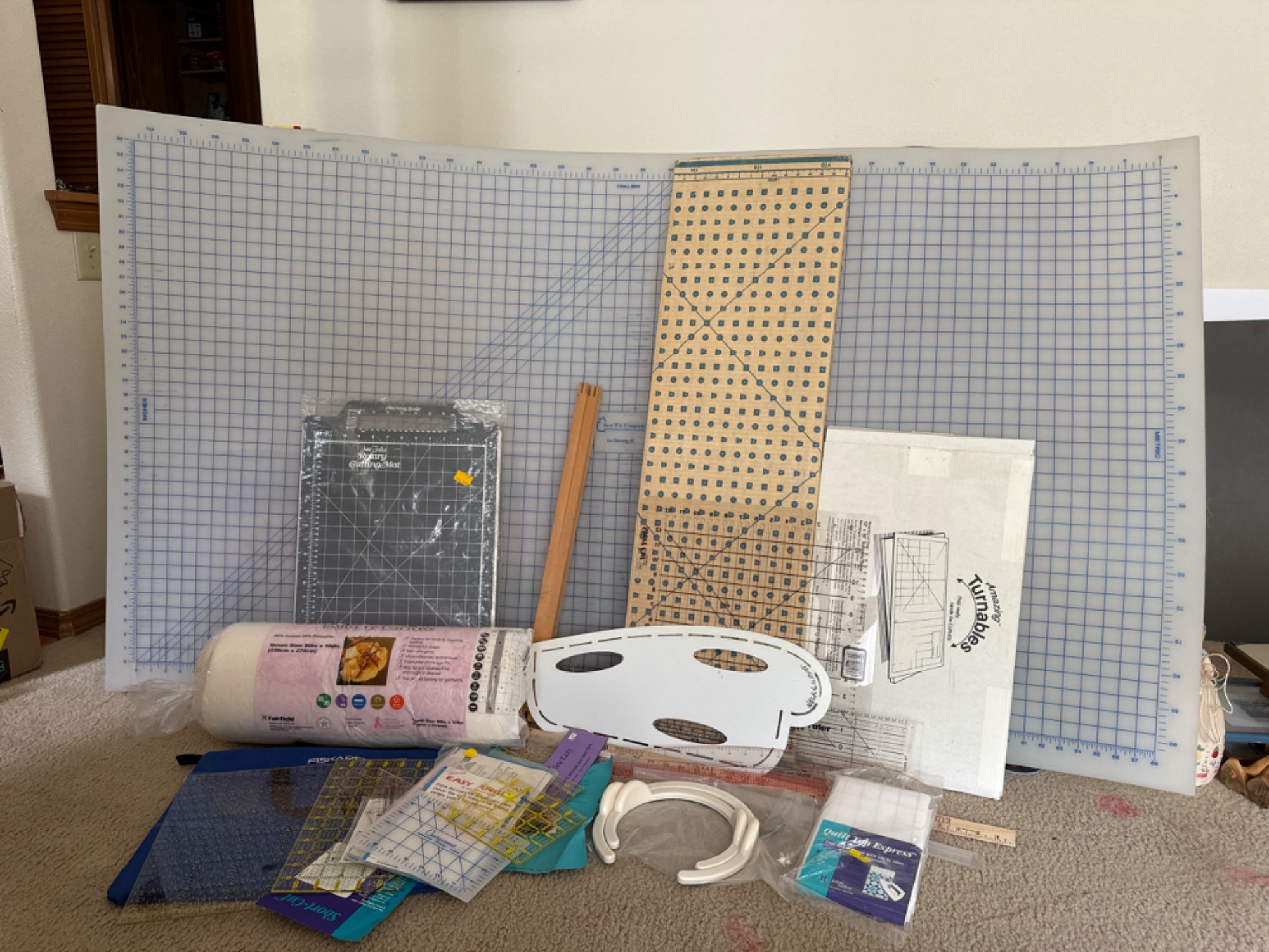 Quilting & Sewing Lot Rotary Cutting Mats Several Omnigrid Cutting Tools in Fiskars bag Turntable Massive 36x68 mat and more