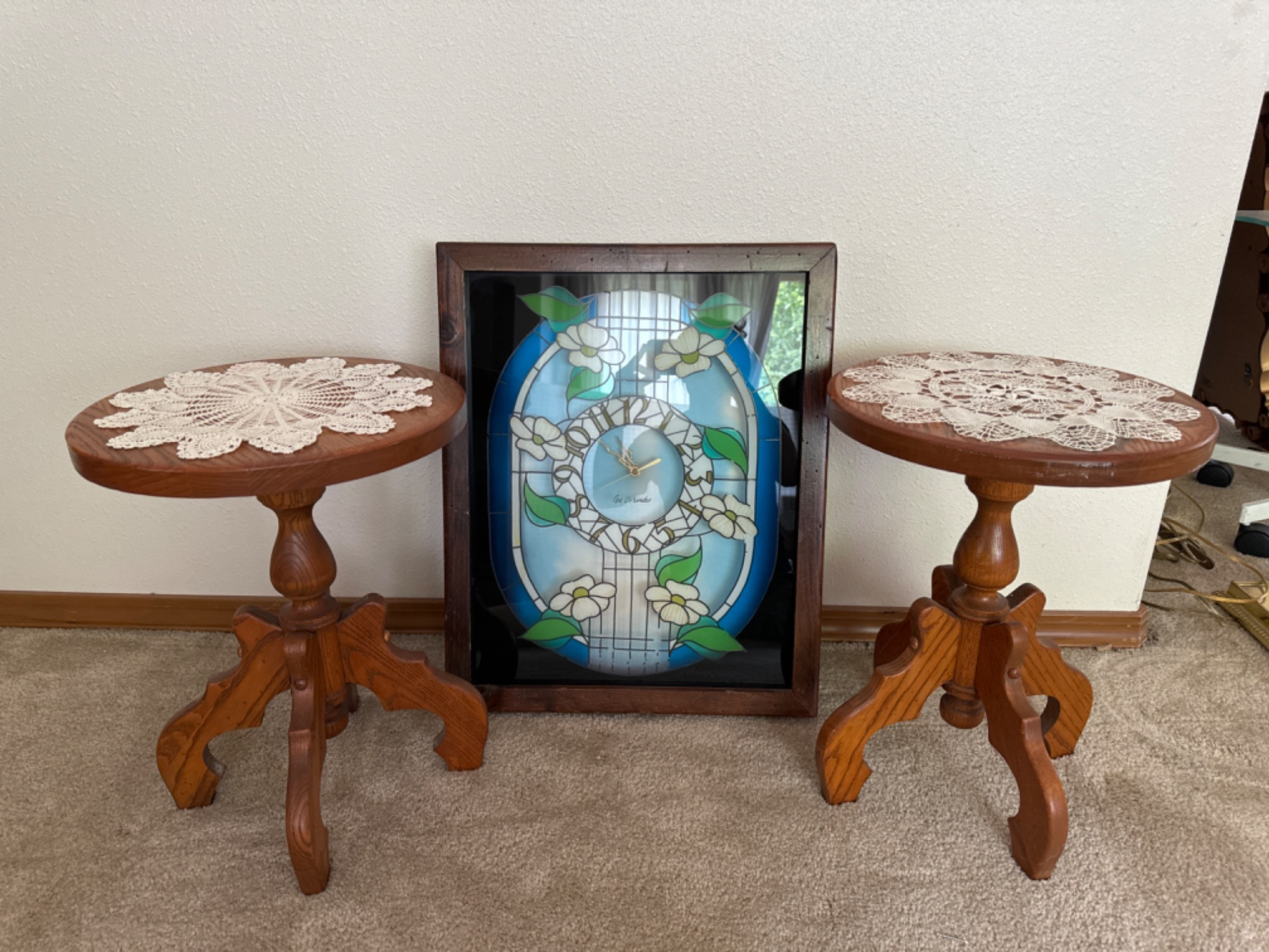 Antique Parlor Table Pair w/Faux Stained Glass Wall Clock Solid Wood Parlor tables: 13"D x 17"T - one stool had a moth or butterfly land its final resting place - It will need refinished. 2 hand bobbin crochet dollies Wood frame clock from Art Unlimited - Faux glass staining, some has started to slip away Frame is 2.75"D x 21"T x 17.25"W