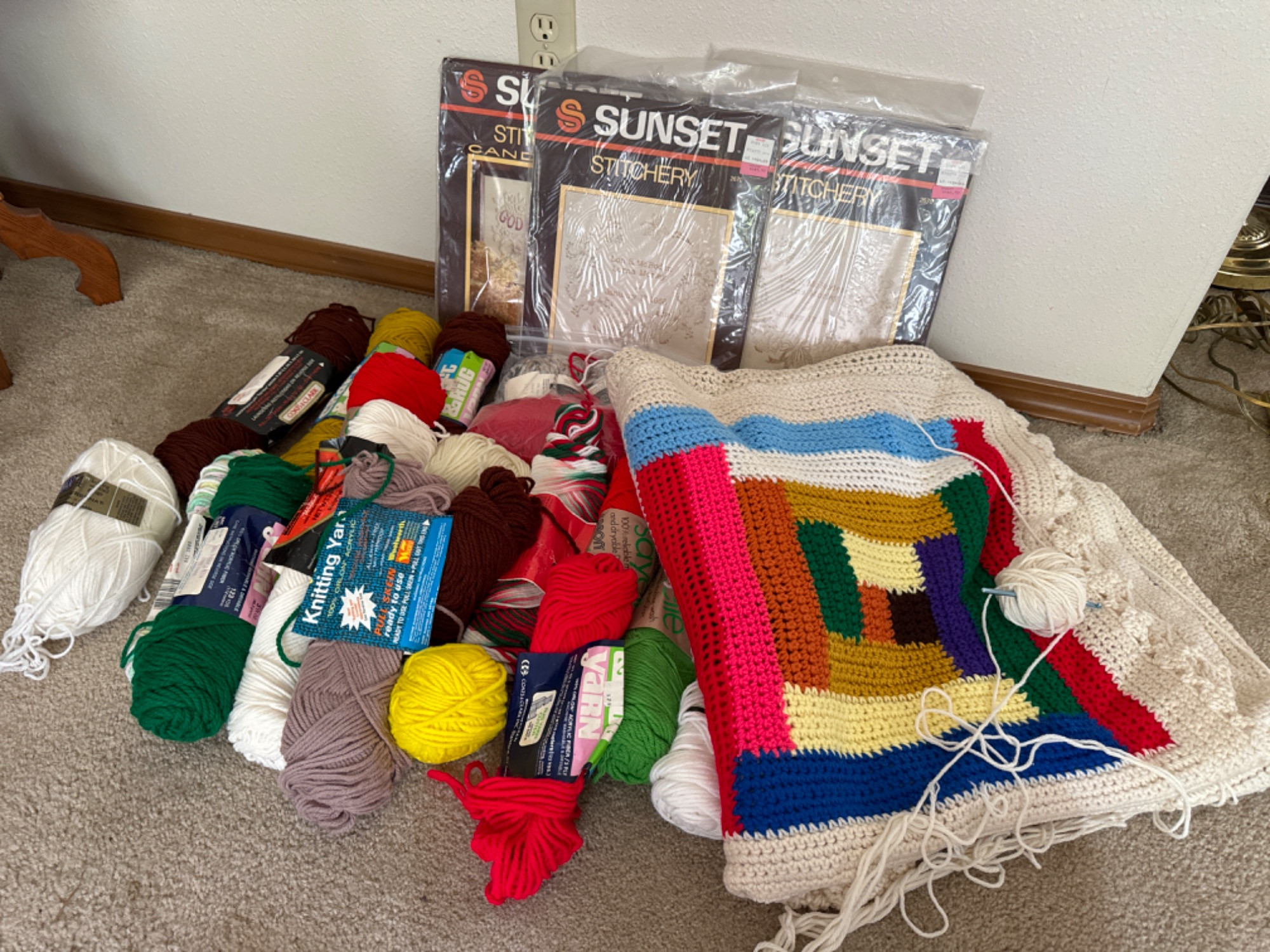 Even More Yarn! Includes an Almost Complete Afghan, just needs edge finished Also has (3) Sunset Stitchery sets