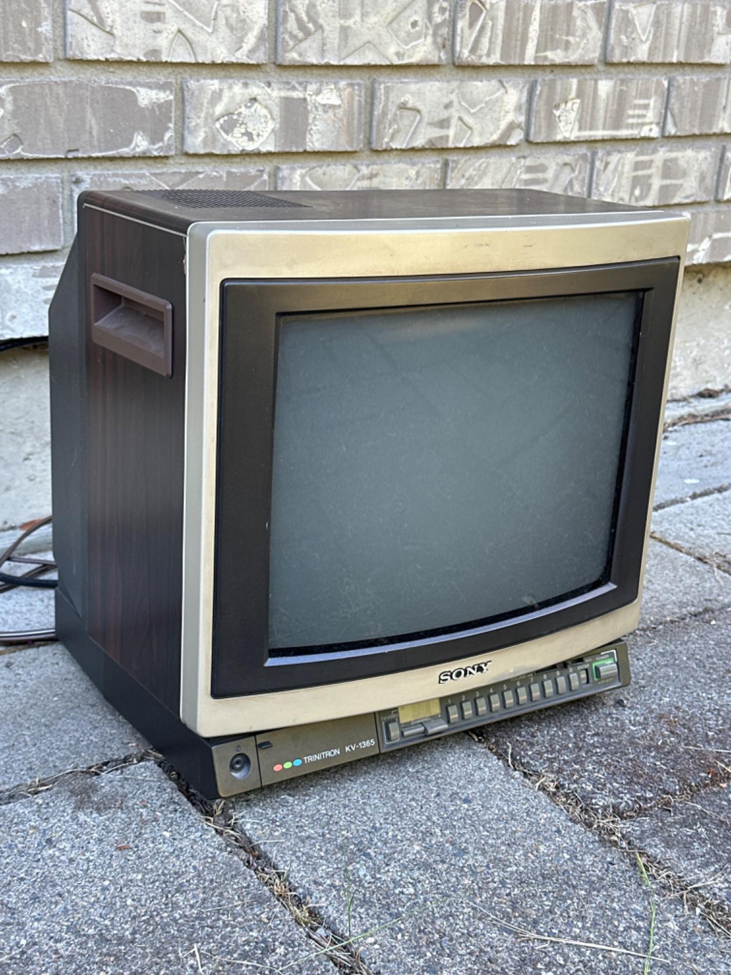Vintage Sony Trinitron KV – 1365 Powers on, screen works (it looks wonky due to the digital camera, the monitor shows plain white to the naked eye) The enter button on the digital tuner is stuck in Cabinet is 14.5 inches wide x 13 inches tall and approximately 16.5 inches deep Coax and RCA inputs, video & mono audio