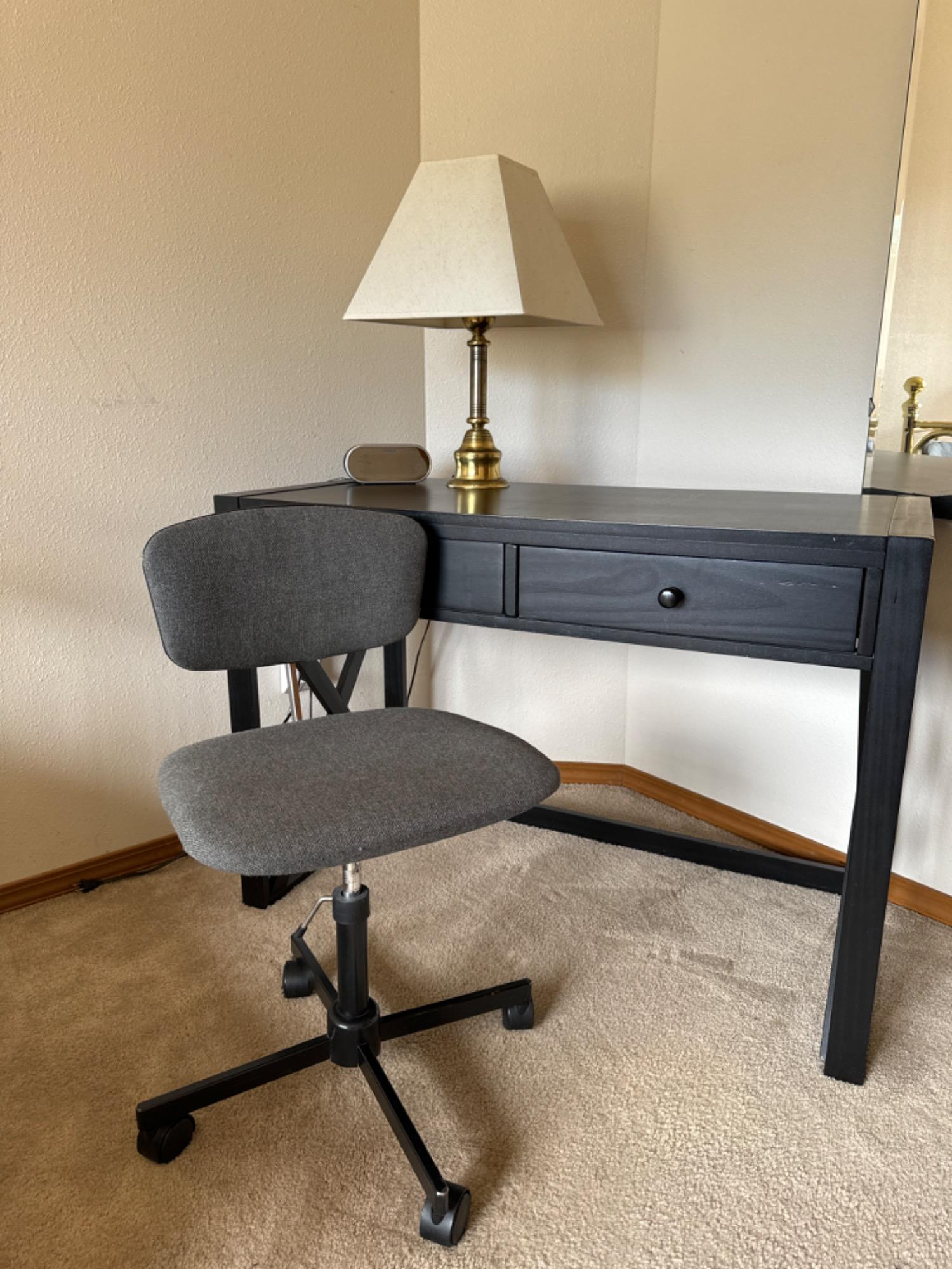 Contemporary Black Desk w/Rabami Rolling Chair Plus Timex alarm clock and vintage brass tone lamp - both work Desk 42 x 21 x 30" - cross bar has come loose