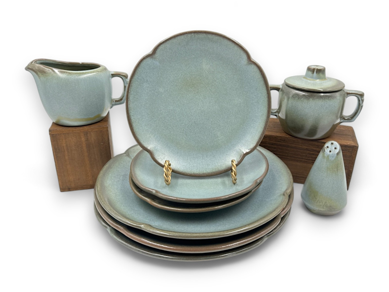 Frankoma Prairie Green Creamer & Sugar Bowl, Shaker - great condition Plates - all seem to have a chip or minor issue 7” 10”