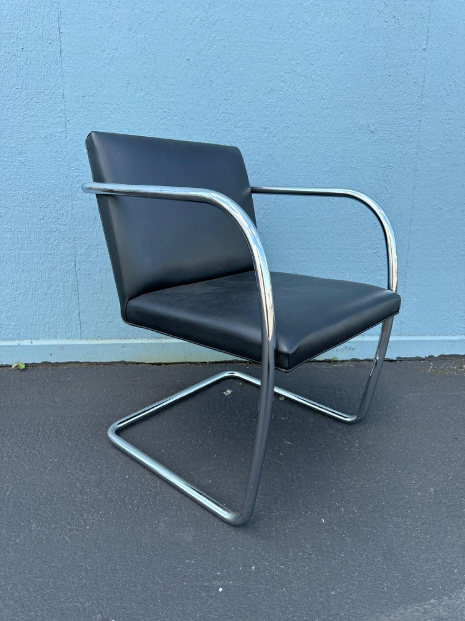 Chrome & Black Leather Cantilever Chair Attrib to Knoll - Tubular Brno Chair by Mies Van Der Rohe Measures 22"W x 30"T x 16" seat height Tear to back leather where chair back protrudes. Discoloration on seat. Chrome is in good condition No tag.