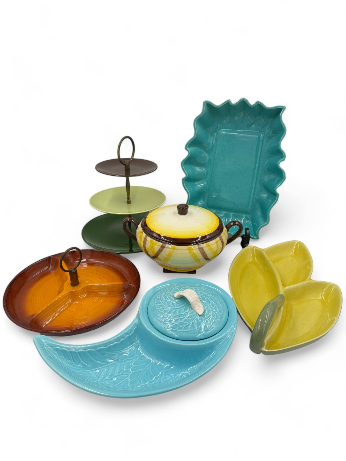 Metlox 2-1/4 Quart Vernonware Poppytrail "Organdie" Round Covered Casserole With Lid 8"D x 11" handle the handle - has chipped underside of lid Los Angeles potteries tray - 14” x 10.5", some minor flea bites Winfield handled tray - 16"L Handled 3 Tier tray - approximately 10.5"T