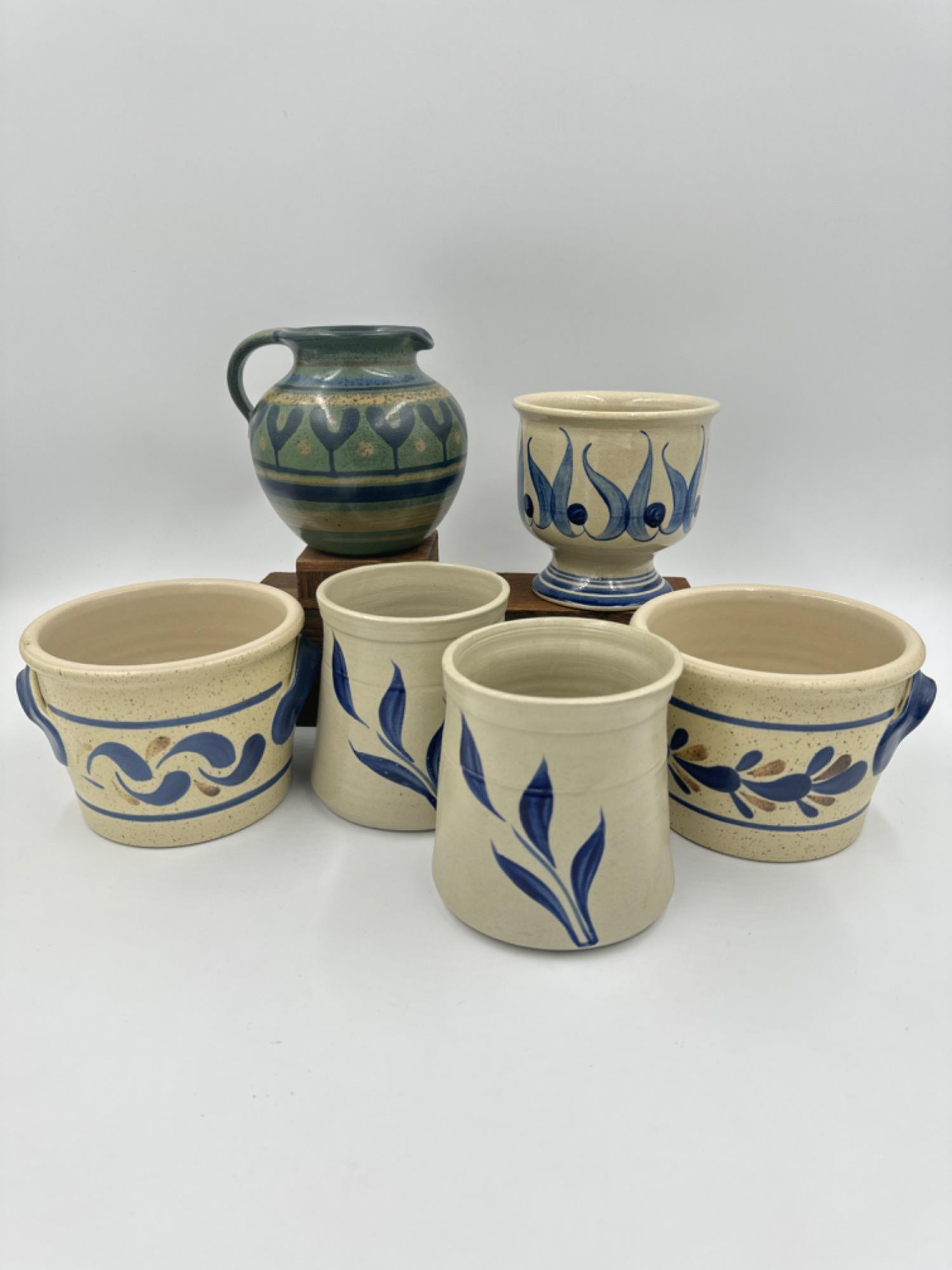 KMK Pitcher - 5"T Unmarked pottery, possibly Coswiger? - 4.5"T Matching Steinweiss Westerwald handled pottery - 4"T x 5.5"D Matching Williamsburg 1994 pottery - 4.5"T