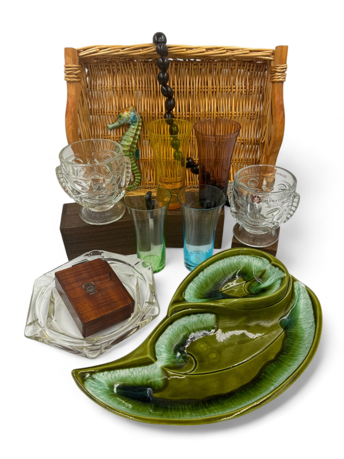 Colorful vases or glasses 5.75"T Kukui Nut Bead Necklace Vintage Santa Anita Ware Green Glazed Ceramic Chip and Dip Tray - 14"L Clear Tiki mugs and more