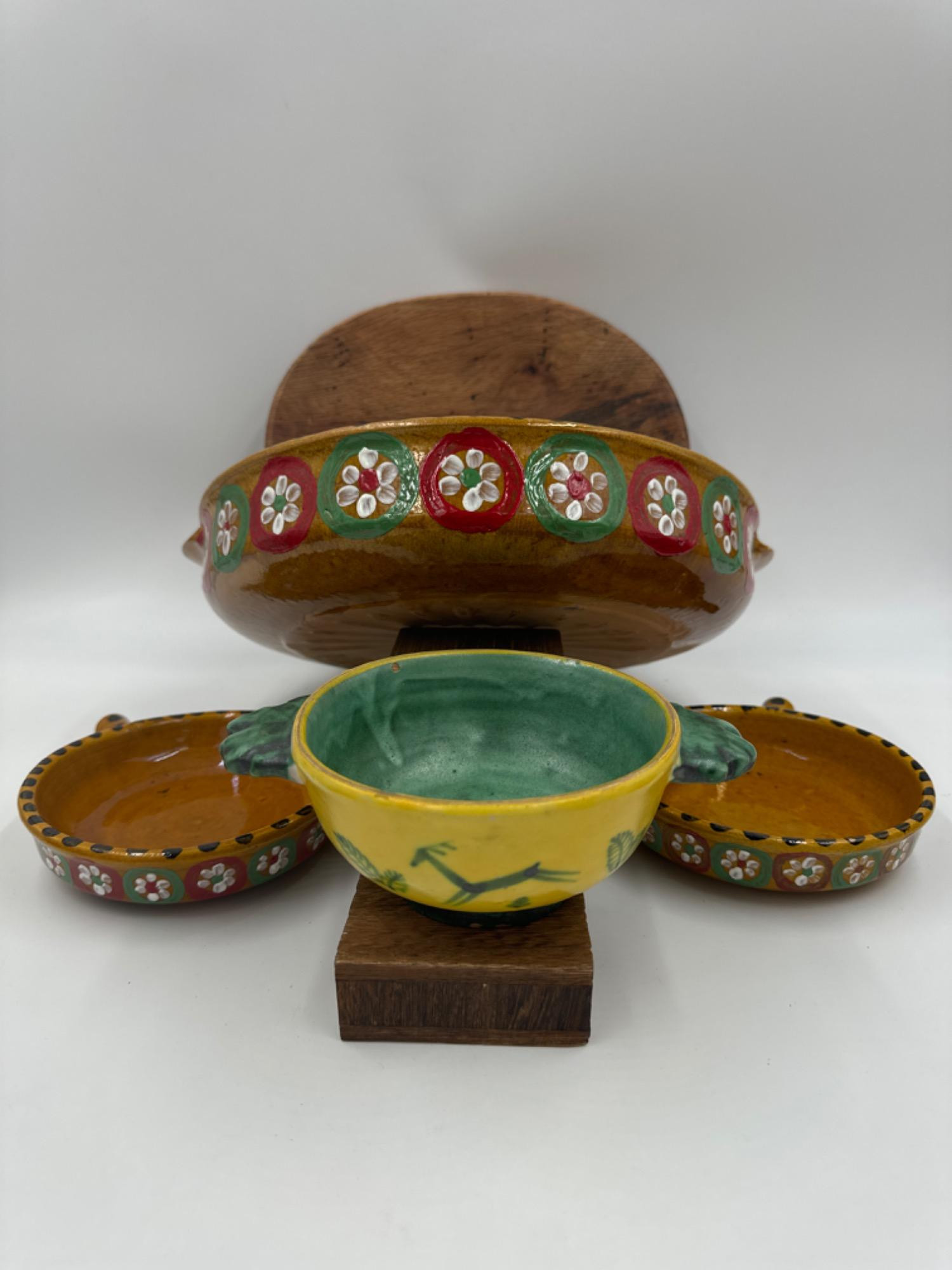 Folk Art Ceramics Mexican Dish Trio Large shallow, handled pottery bowl 13" handle to handle x 12"D x 2.5"T - has chipped glaze on one handle Matching single handle dishes - 7" to handle with 5.5"D Handled Italian Majolica dish - 7" handle the handle x 5”D x 2.5”T - small chip to finsh Carved wood bowl - approximate 11-10"D
