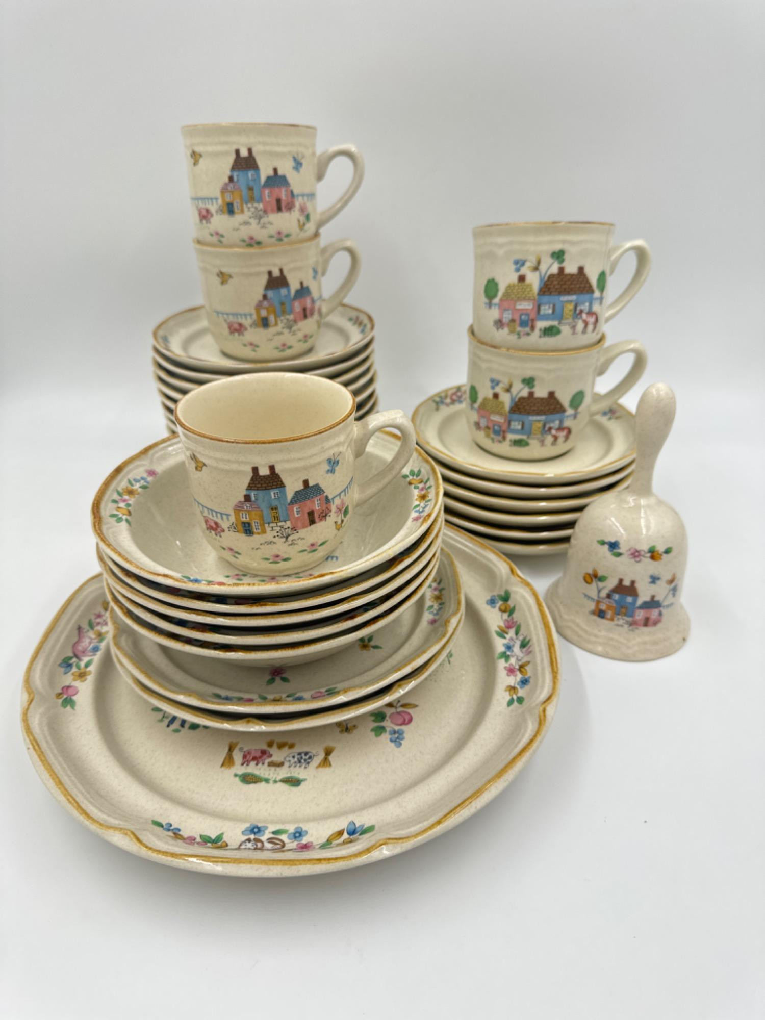 Vintage International Heartland Village Dish Set Includes (2) more modern 105 coffee cups and (6) saucers Original set - (1) dinner plate 10.25" (4) bowls 6.75" - There are two more included, not photoed here, heavily faded images (2) plates 7.5"- one with a chip on the back. (3) mugs - damage to base of one (12) saucers (1) bell