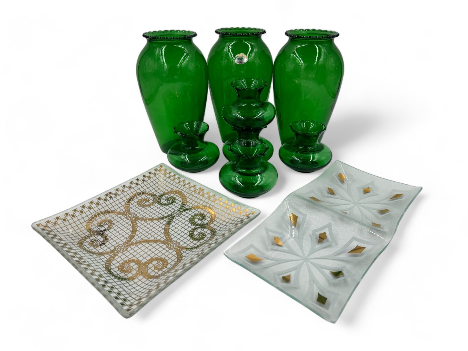 (3) Anchor Hocking glass forest green 9.25” vases (5) 3.5" mini vases - only one stamped Anchor Hocking on the base Plus 2 Mid century pressed glass trays