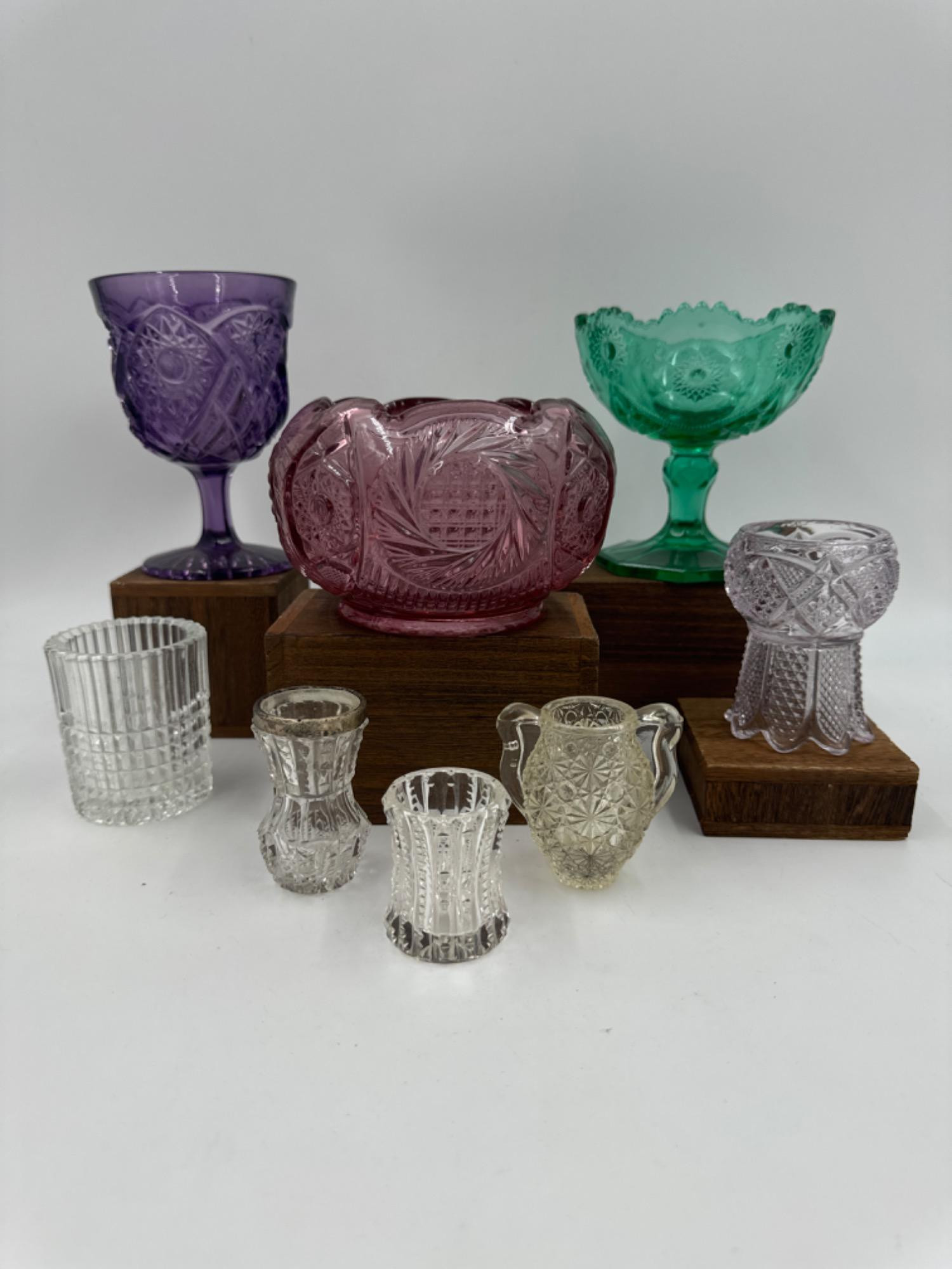 Antique & Vintage + Pressed, Cut, & Depression Glass Purple goblet - 5.5”T Green pedestal dish- 5”T Pruelpe Pink (possibly Fenton Orchid) rose bowl 3.5”T Smalls range from 2“ to 3.25” tall