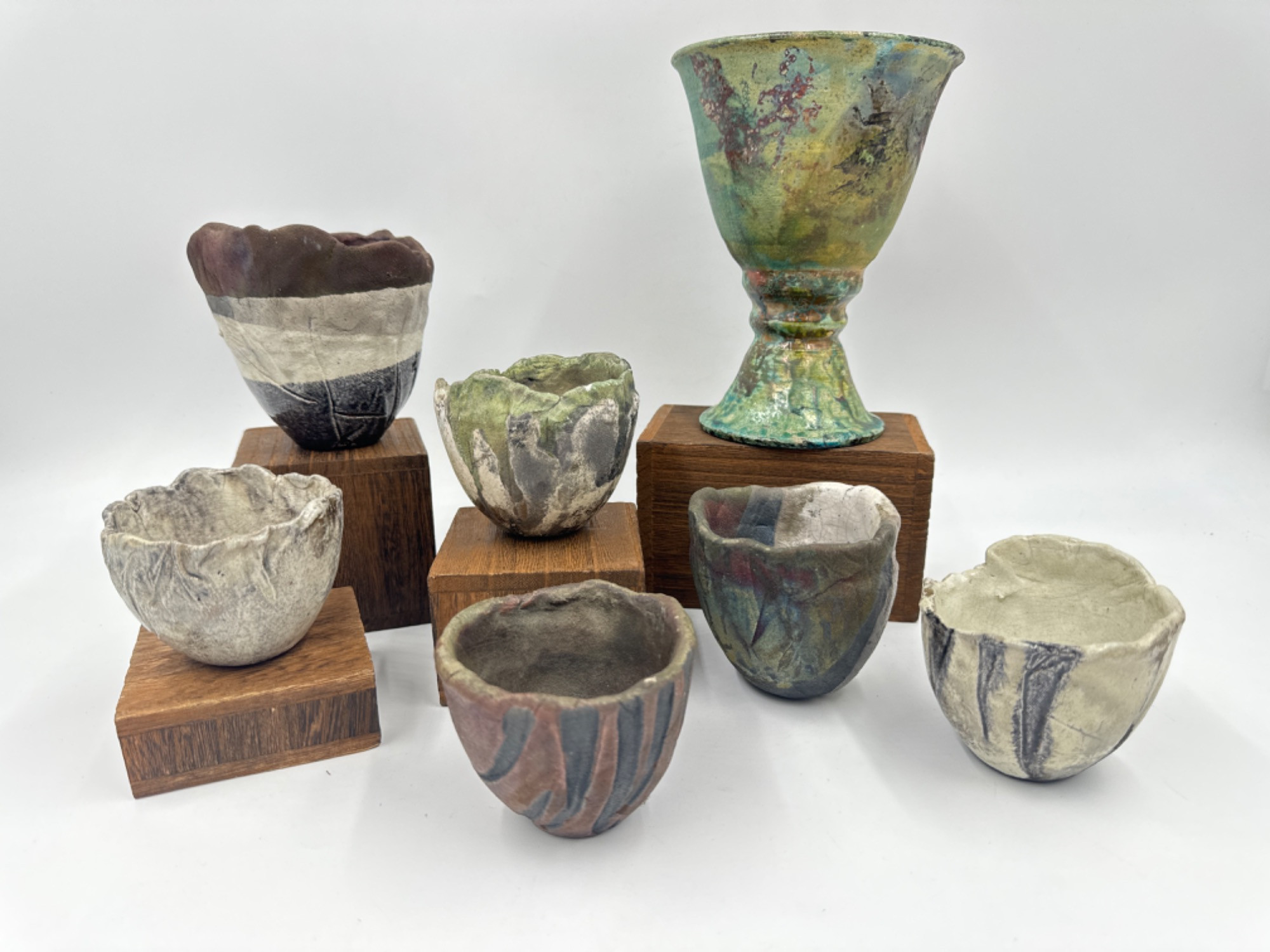 Bedford pottery Small bowls/planters range in size from approximately 2.5” up to 3.75” - 2 appear to have damage Chalice measure 6.25"T x 4.75"D