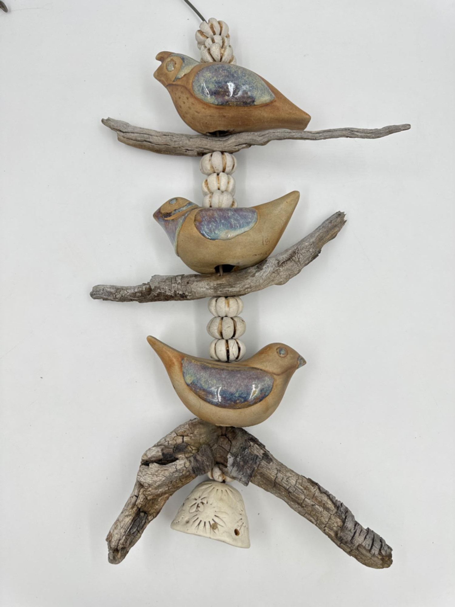 Vintage 1981 CA Pottery Artist Hazel Olsen Bird Form Pottery & Driftwood Wind Chime Missing chimes. 19”L Each bird is approximately 5.5”L