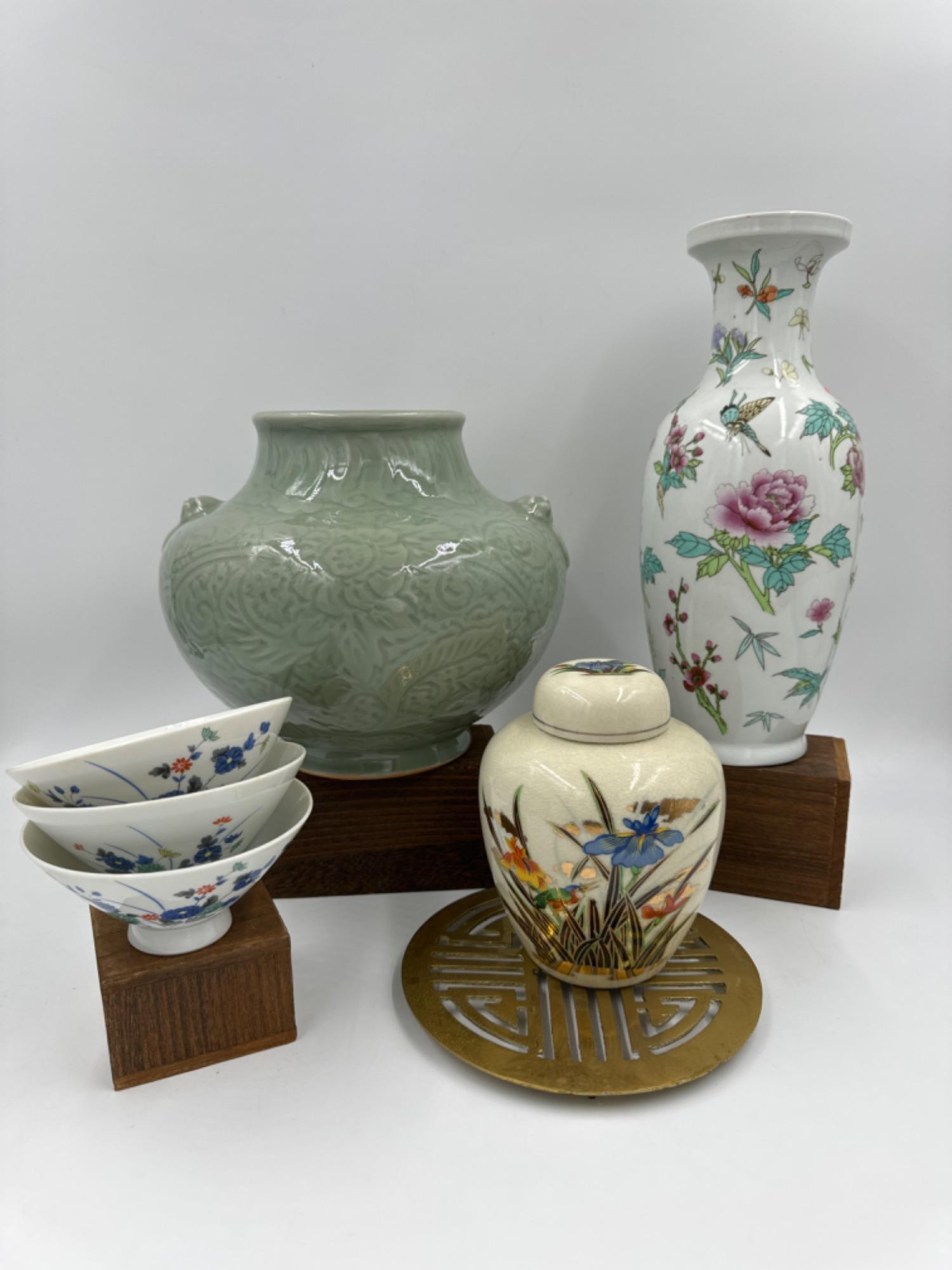 Lot # 77 - Signed Chinese Porcelain Hand Painted Vase + Celadon Vessel +