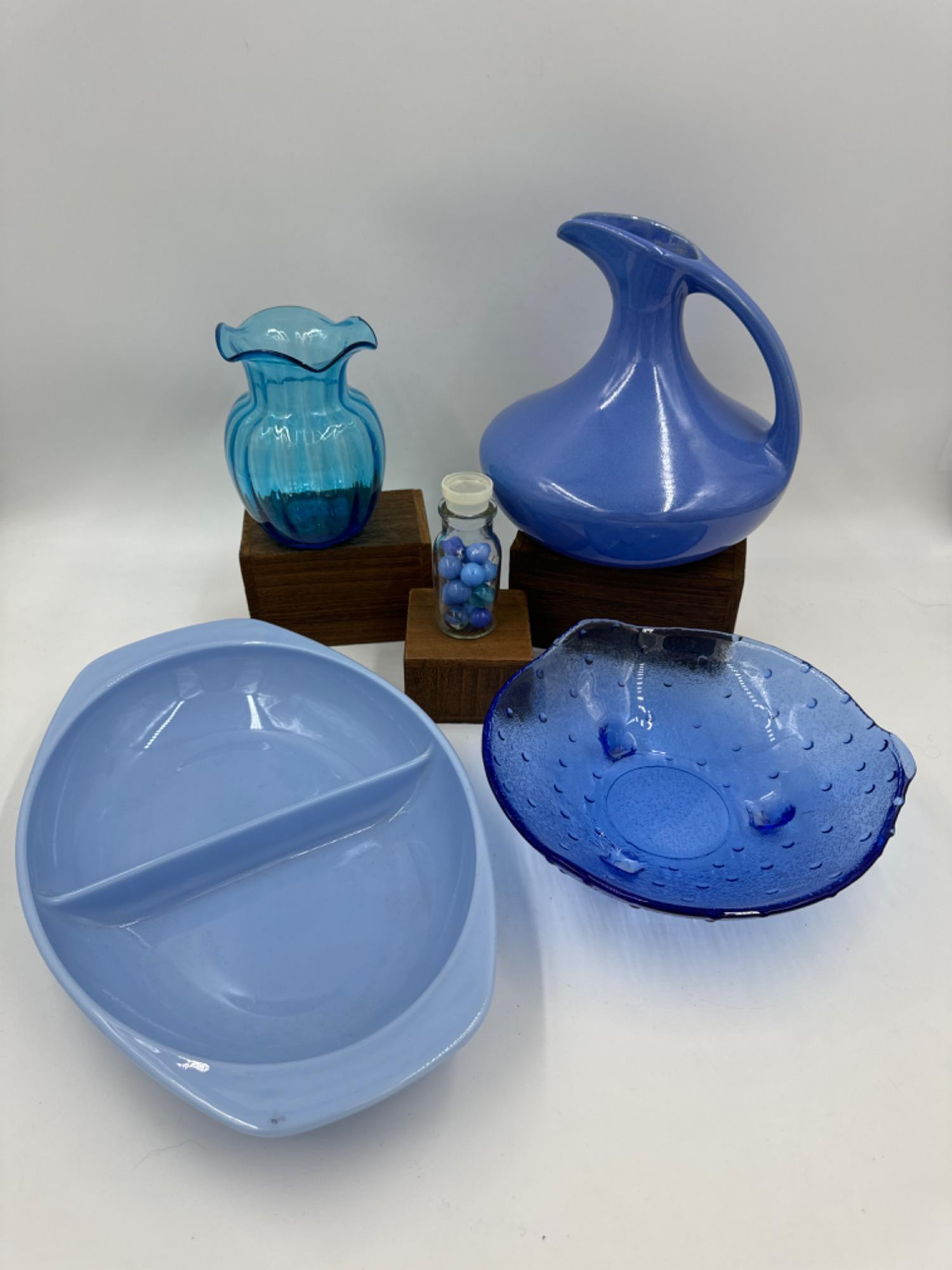Three footed hobnail bowl is approximately 8.5"D Marbles Blown glass vase 5.5"T MCM California Pottery by Garden City Pottery of San Jose Pitcher - This is the proprietary blue from Garden City. Measures: approximately 8”T with a diameter of about 7.5 to 8” Everything is in great condition