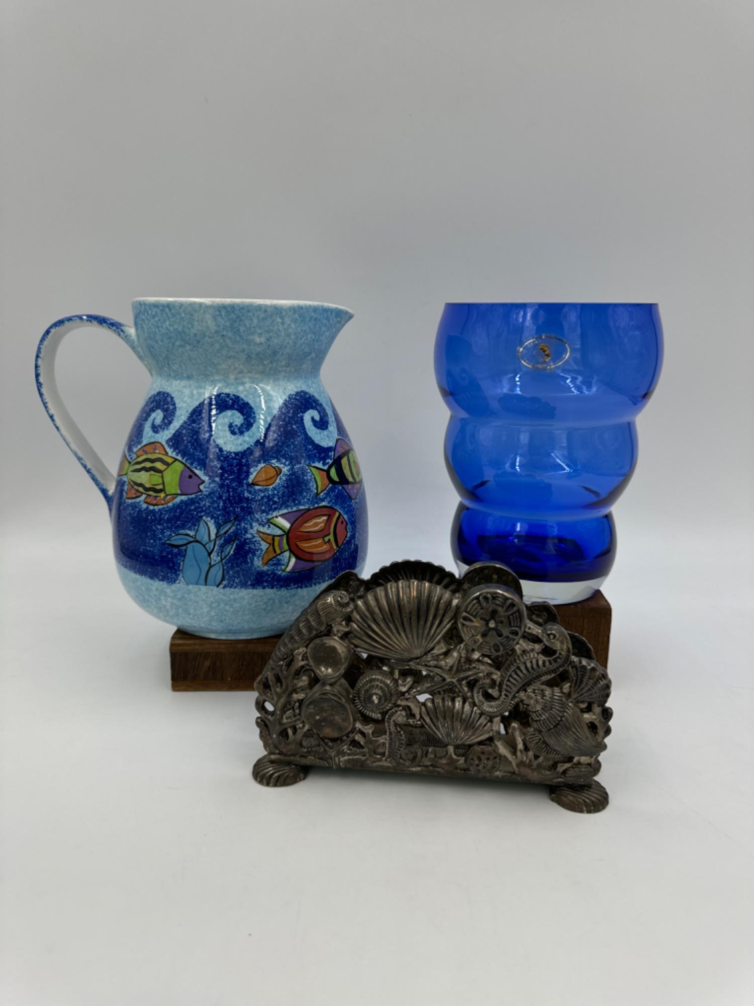 Sango Pisces Fish 68oz Water Pitcher Designed by Sue Zipkin - 7.5"T Cavalier glass vase - 6.5"T Godinger Silver 1994 Silver Plate Napkin Letter Holder 6.5"L