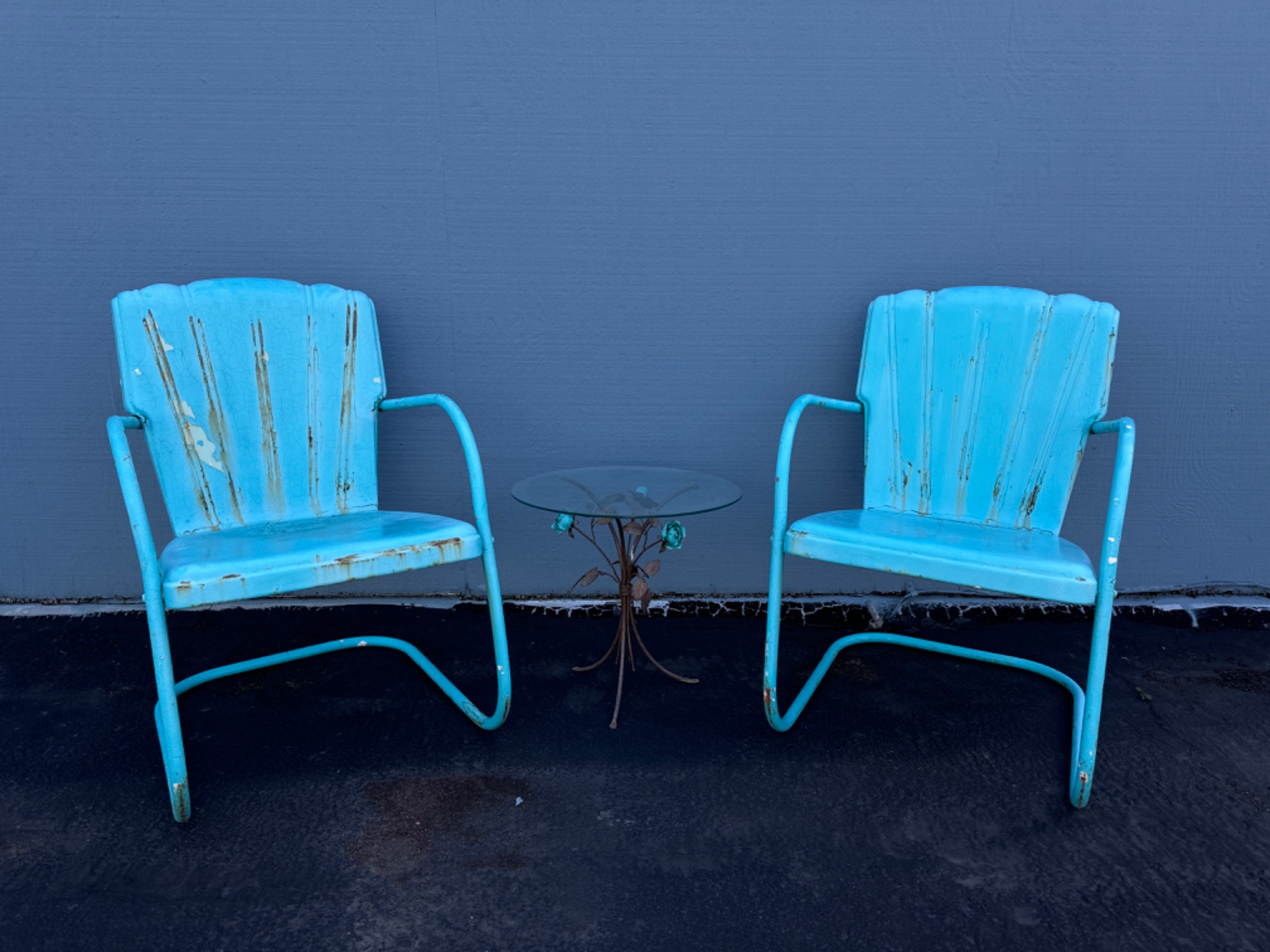 Hollywood Regency Glass tabletop is 18”D x 17”T Chairs are sturdy. Have several layers of paint and some surface rust. Chairs measure: 21.5”W x about 24”D x 32”T