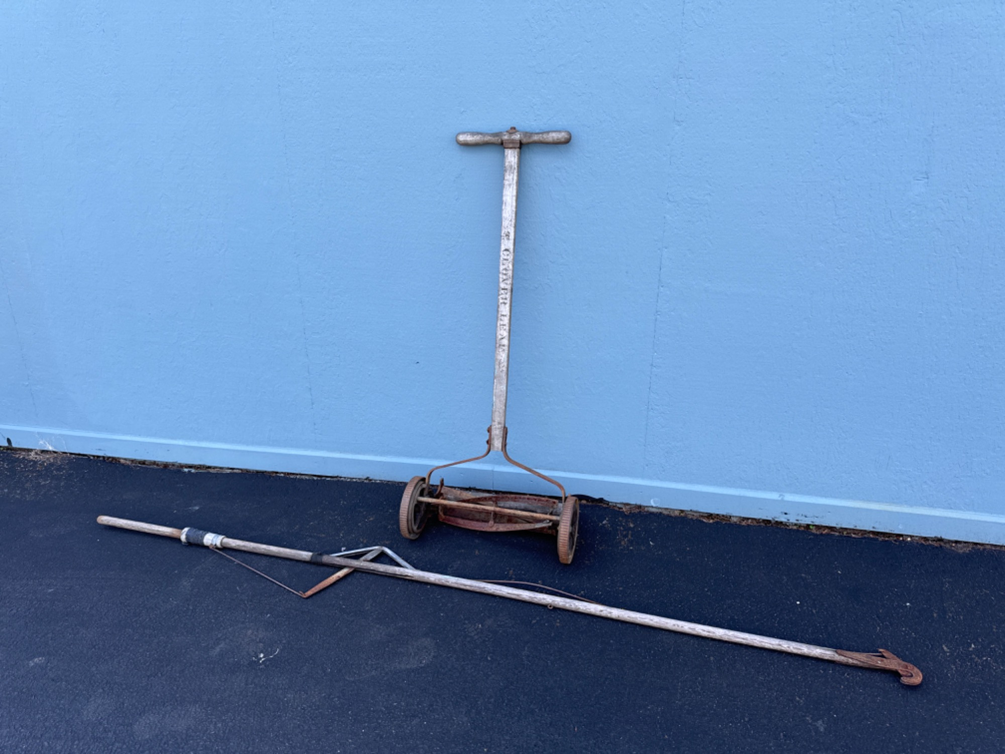 Antique 1920s F & N Clover Leaf Reel Push Mower & Vintage Limb Trimmer Wood and steel mower approximately 52.5”T x 21.5”W at the base 102”L lopper - works, great decor too