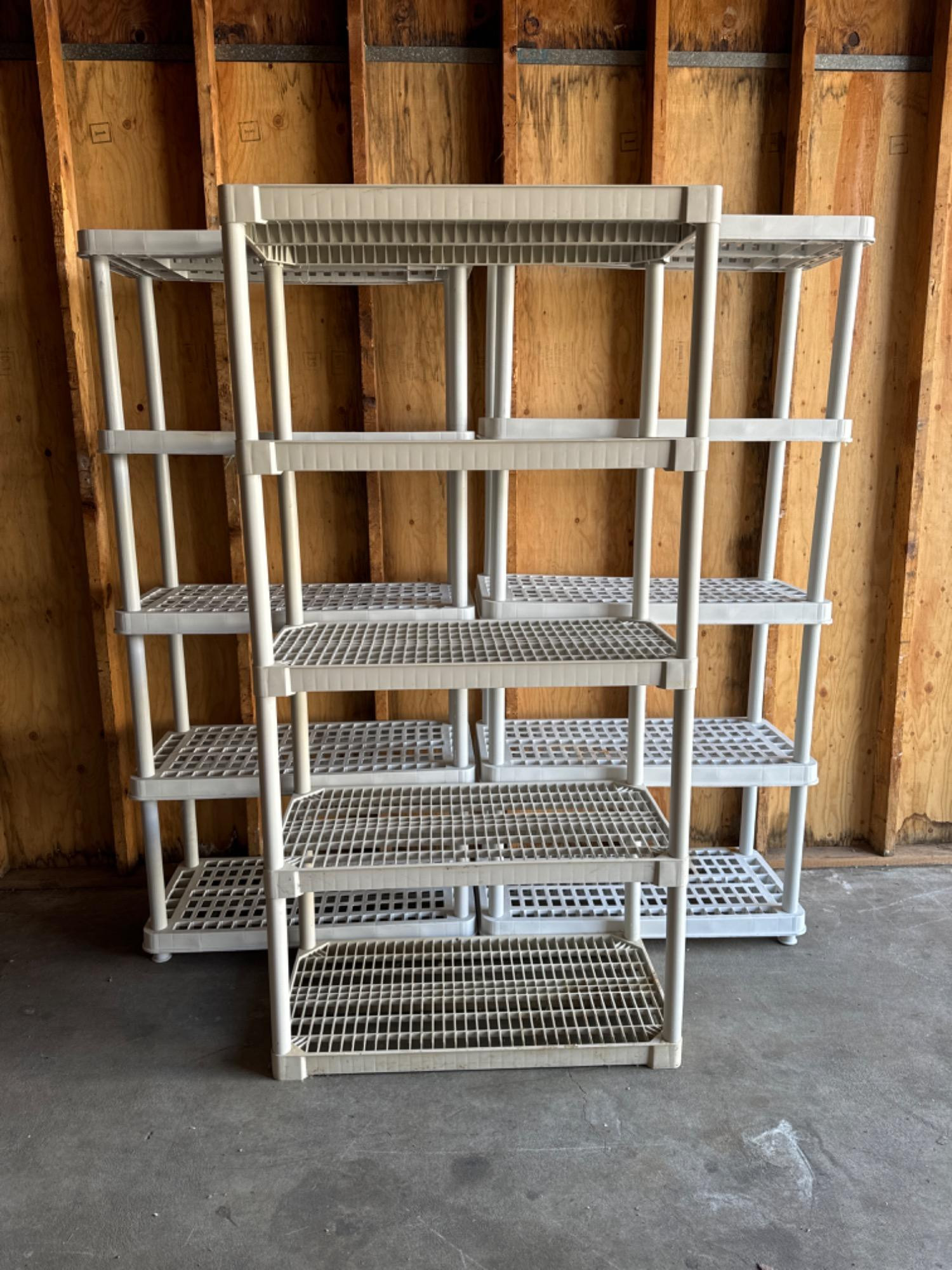 Trio of Off White Plastic Storage Shelves (1) Contico Shelf - 36”W x 18”D x 71.75”T (2) Unbranded 36”W x 17.75”D x 73”T - has stain and 2 noted damage areas