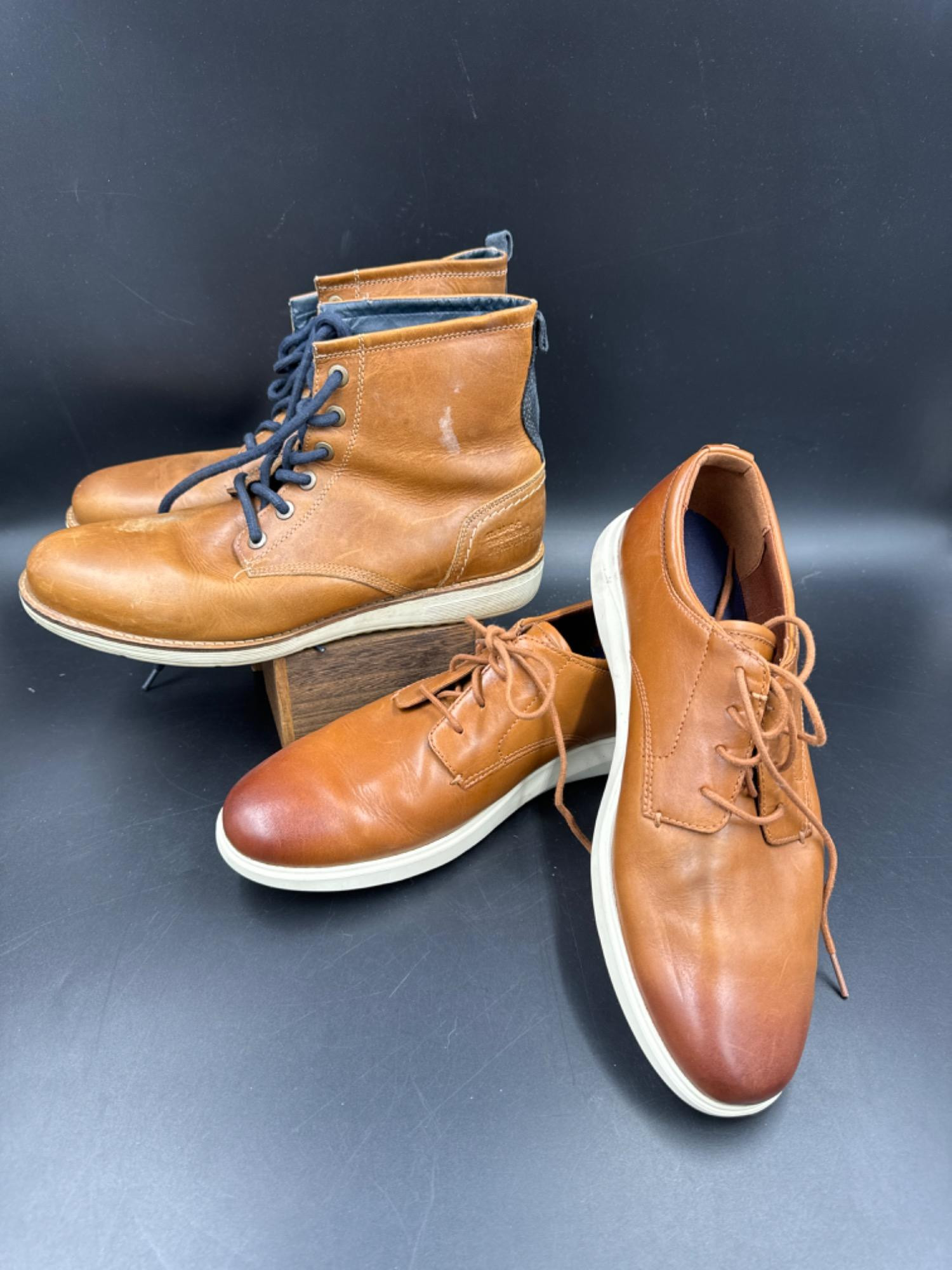 Men's Brown Leather Cole Haan Shoes Size 10.5 & Bullboxer Boots - Size 10 Both have been worn with noted scuffs Boots appear to be lined.