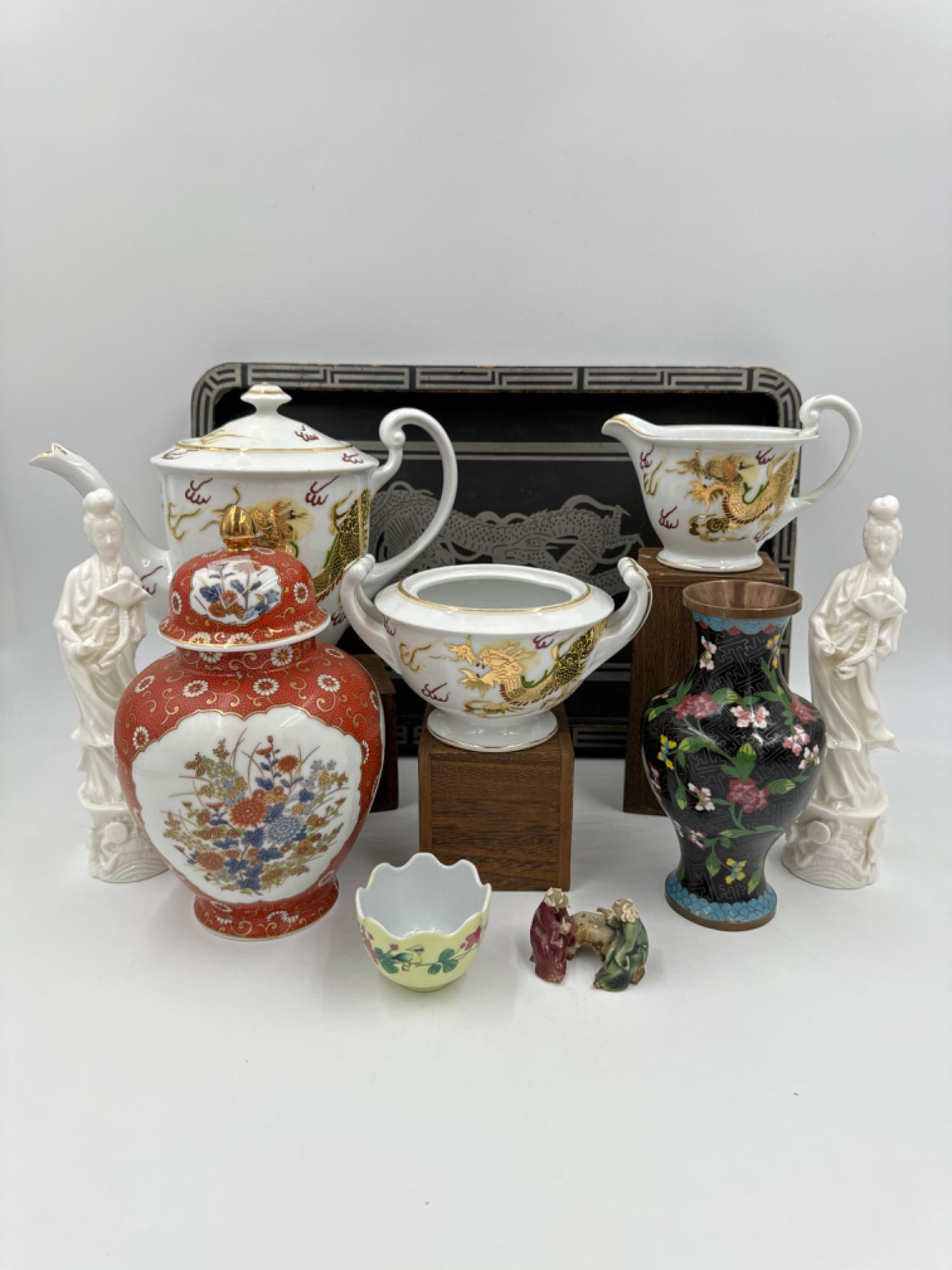 Mid Century Black Enamel Floral Cloisonne Bud Vase - 6.5" (2) Blanc De Chine Porcelain Kwan Yin statues - 8.25"T Dragonware Tea Set - missing sugar bowl lid Mud men figurine OMC Ginger Jar Lacquer tray