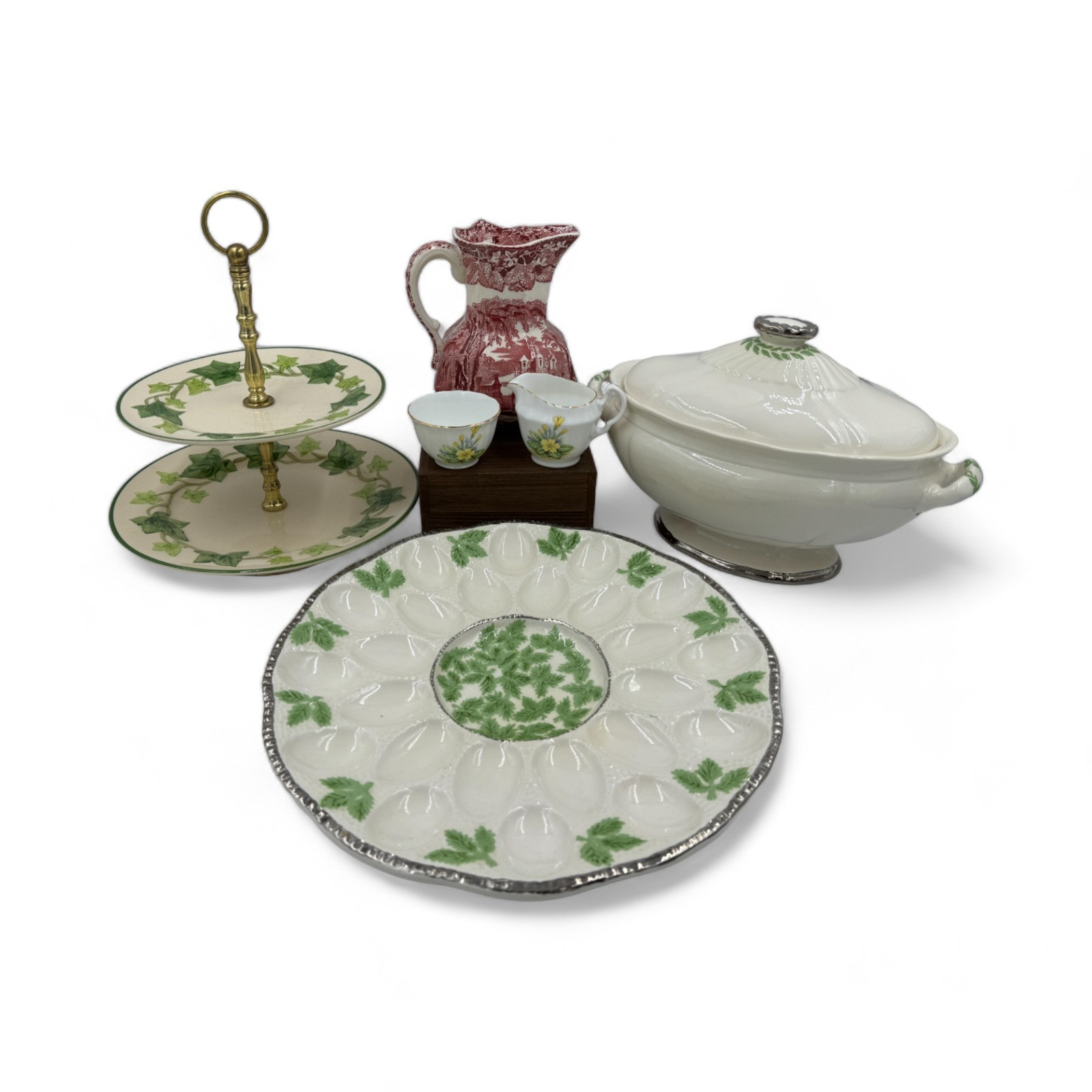Adderley fine bone China open sugar cup and creamer 13.25"D ceramic deviled egg plate with match tureen (has chips) Antique Mason's Ironstone 'Vista' Red Pink and White Transferware Jug - 6.5x6" Franciscan Green Ivy 2 Tier Tray