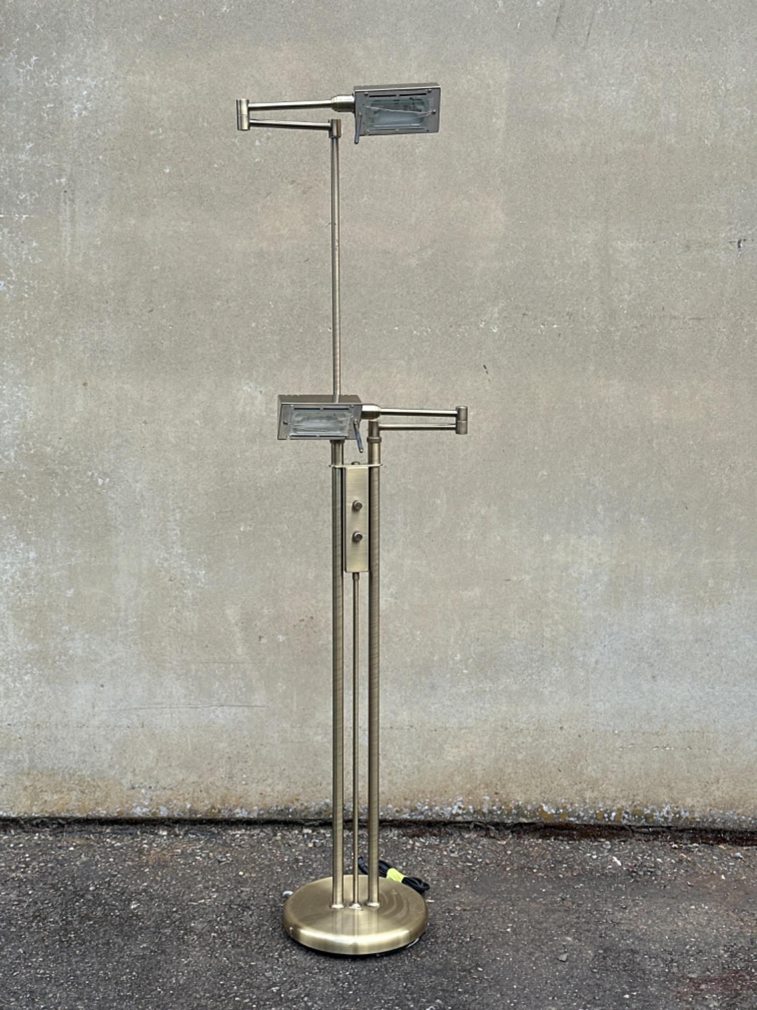 Tested, works Each light is independently dimmable and adjustable in height like a microphone stand brass finish dual light articulating Floor Lamp base is 10”D Height is approx 36” condensed, and 59” extended