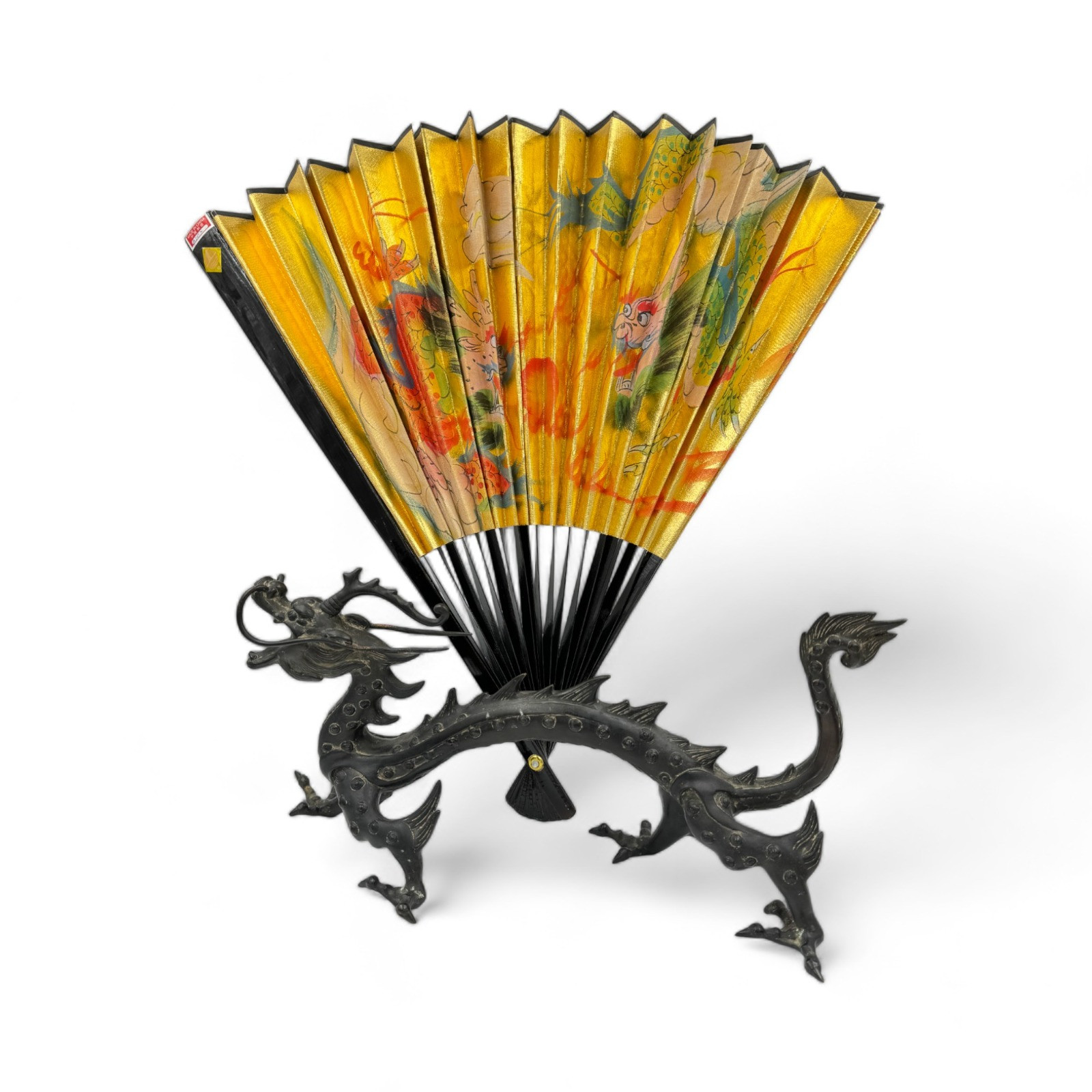 Fan is 24.5"T - comes in original box HEAVY cast metal dragon, possibly copper or bronze - great condition Approximately 20"L x 9.5"T x 7"W
