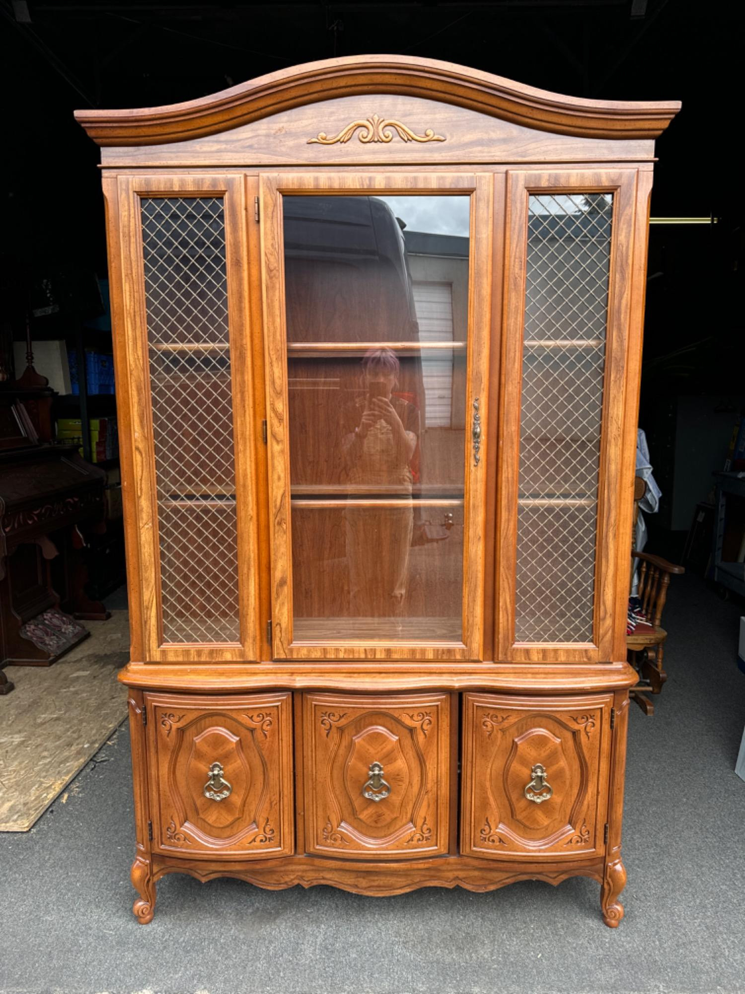 Vintage 1970s Lighted China Cabinet w/Brass Accented Glass Separates into two pieces - doors on the base are composite material. Glass shelves are included and wrapped, ready to go. The base section is 50.25"W x 16”D x 26.75"T 80.5”T combined (6 feet 8 inches) Minor wear. In good condition. Light works.