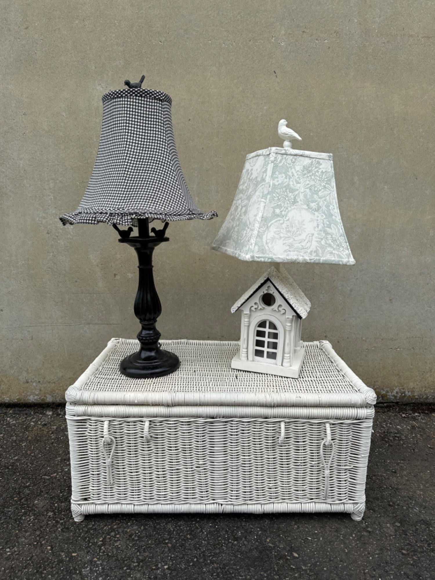 Shabby Chic Decor - Bird Themed Lamps & Wicker Trunk Wicker trunk measures: 22.25" x 13" x 10"T Black bird lamp - 23"T White birdhouse lamp - 25"T