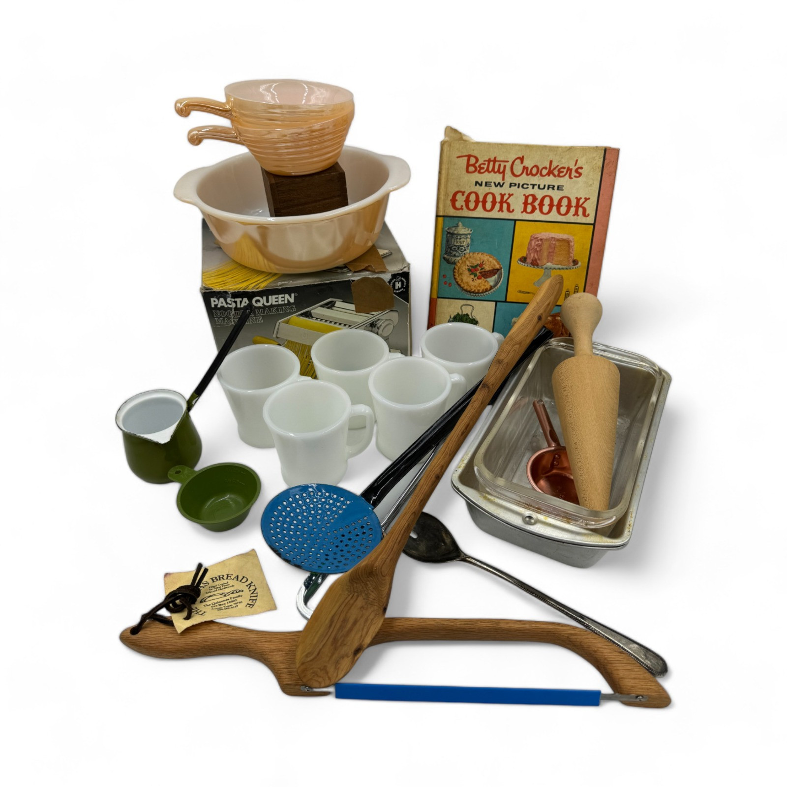 Fire King Lustreware bowls in great condition (5) Fire King milk glass coffee cups Enamelware Blue Metal Skimming Ladle & green Turkish Coffee ladle Fiddle Bow Texas Bread Knife Handcrafted Hardwood by Quinones Family Hand carved long spoon - 19" Betty Crocker's New Picture Cook Book Pasta Queen Noodle Making Machine and more