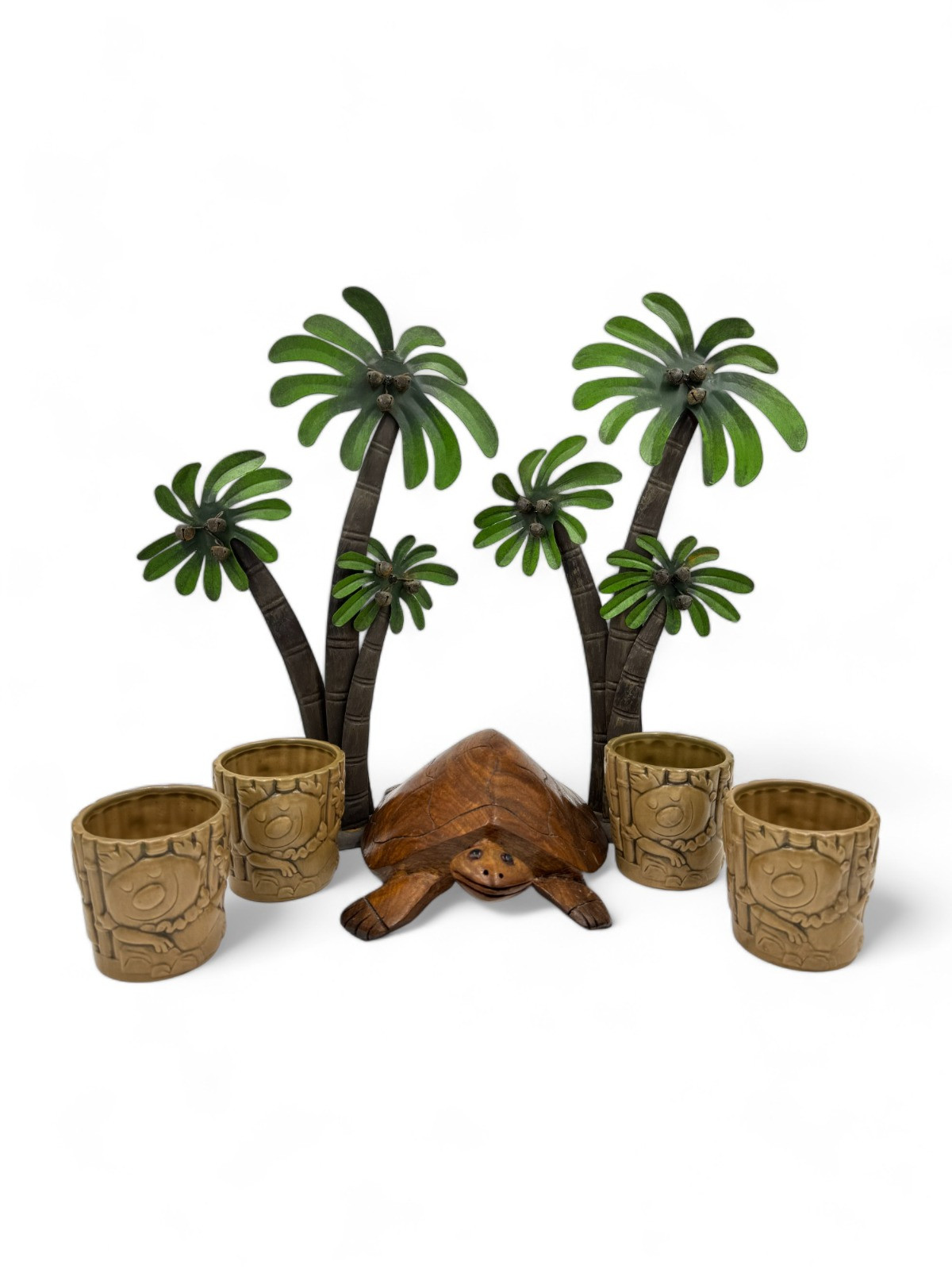 4 mug set - Like New Vintage carved wood turtle with glass eyes - approx. 13.5”L x 8”W 18”T metal palms w/ bells