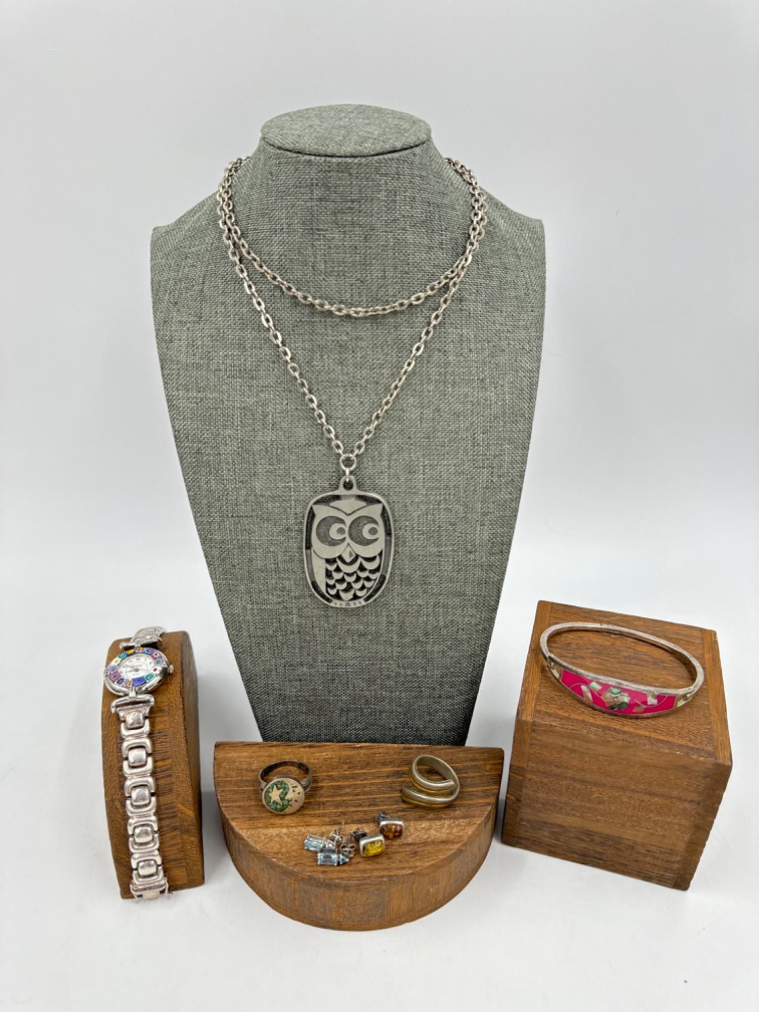 Sweden Pewter Owl on 26”L chain Murano Millefiori Watch with Sterling Silver Band - 40 grams Sterling post back amber and blue stone earrings Alpaca & Mexican Silver pieces