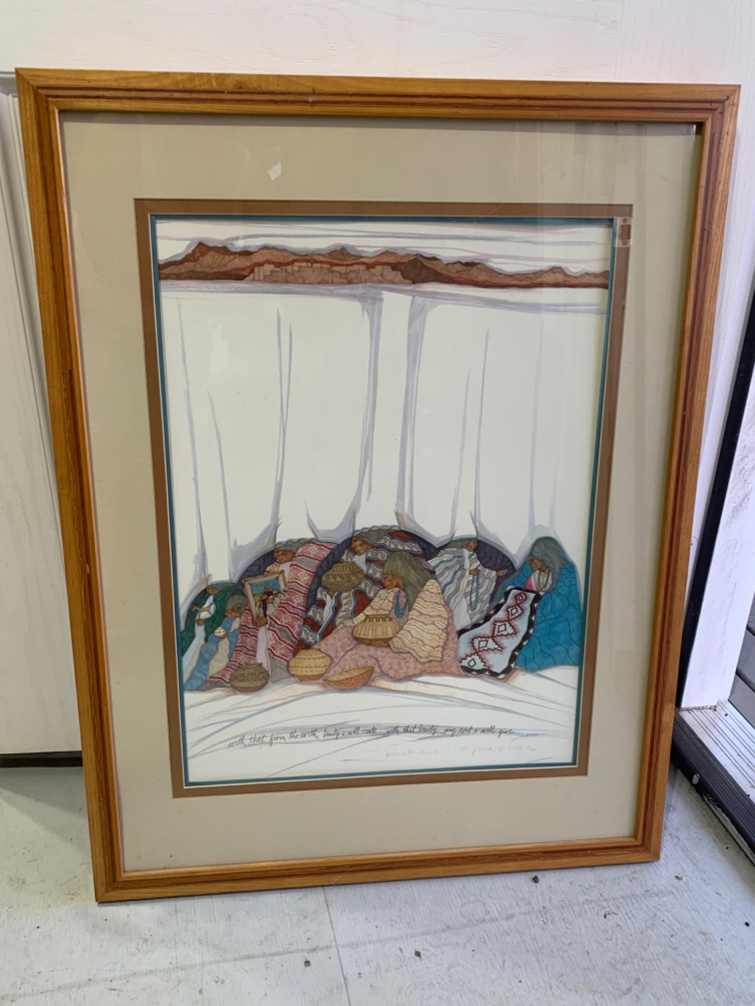 Signed by Amado Pena Jr. Dated 1982. Oak frame. Phrase in print “with that from the Earth, beauty, I will create. With that beauty, my soul I will give”.