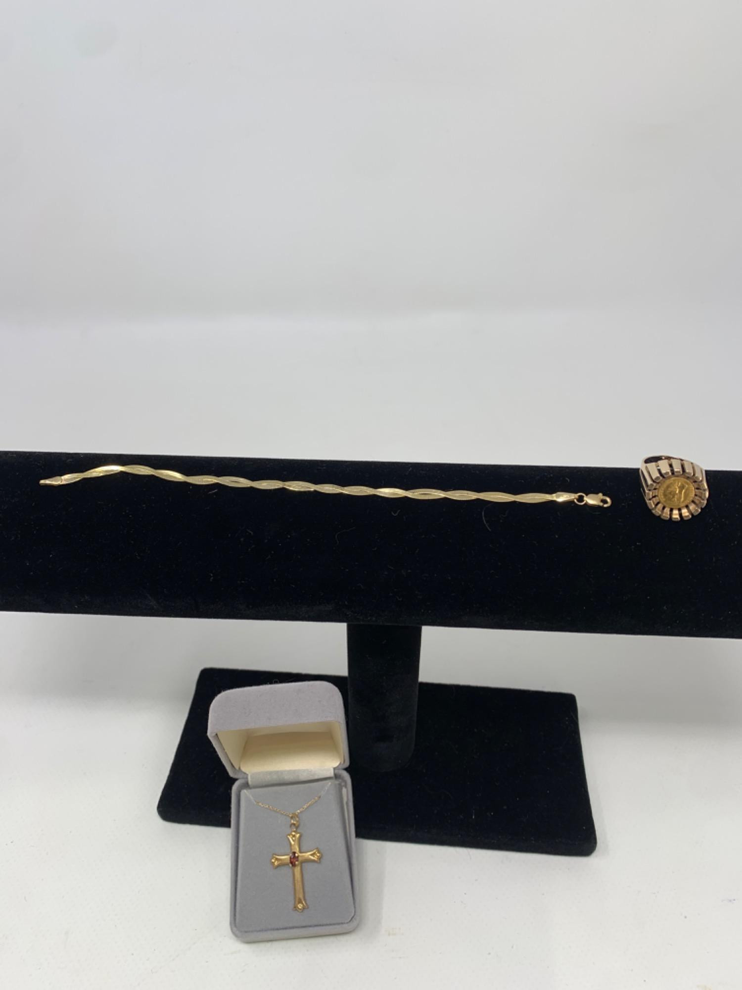 14k gold braided chain bracelet. Bracelet is 7in long. 14k gold necklace with gold and Garnet gemstone crucifix. Necklace is 8in clasped. 14k gold coin ring. Size 6. Items are 10grams weight.