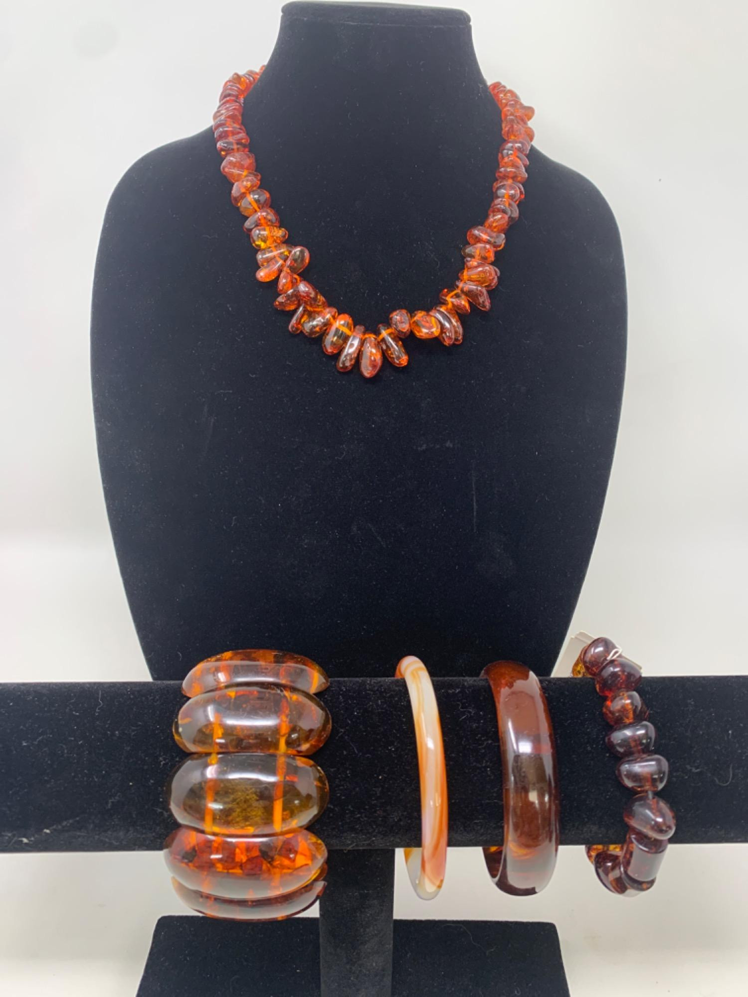 One glass bracelet, two large plastic bead bracelet. Both with inclusions. One Bakelite bracelet. Amber bead necklace with inclusions. In good condition. One still has tag.
