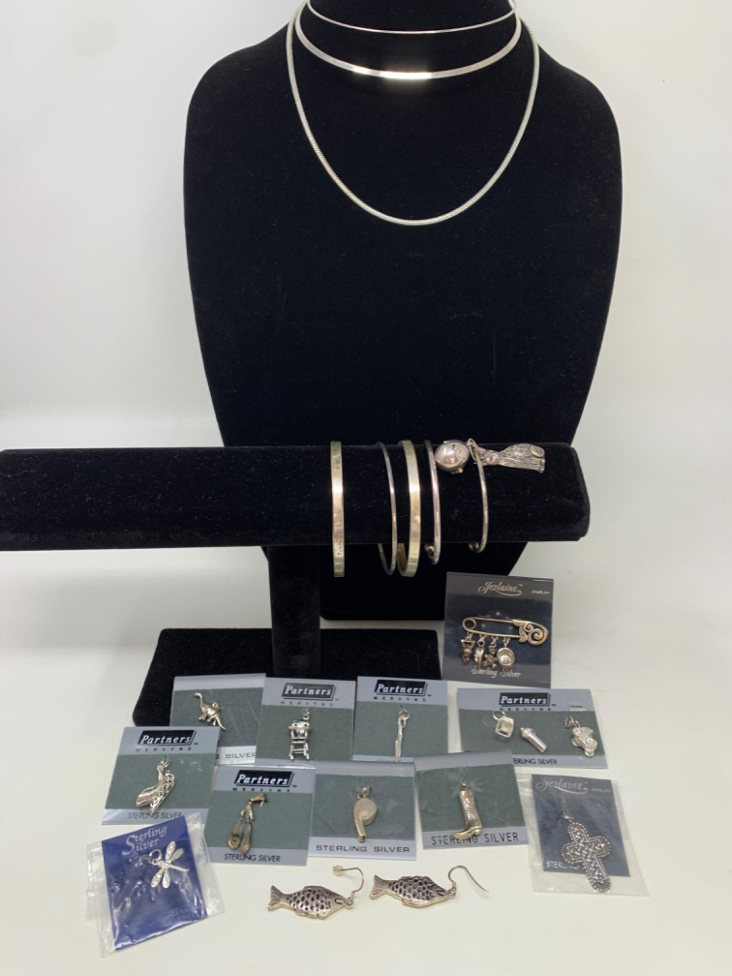 NIB- Sterling silver charms, earrings, brooch, necklaces, bracelets and neck rings. See pics for details. Lots of value here. Loose Sterling is 55grams. Packaged sterling is 63grams.