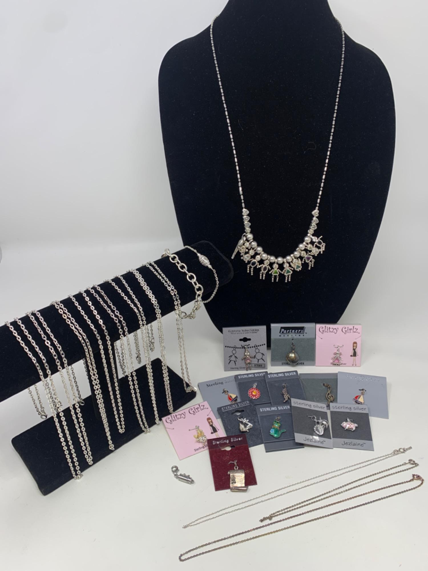 14 Sterling silver charms are new. Three sterling silver chains. Two sterling bracelets. Eight silver chains great for charms. Long chain necklace with variety of sterling silver charms. 14in long. Birthstone accents. Lots of value in this lot. Necklace extender. One bunch is 60grams. Charms weight with package is 62grams.