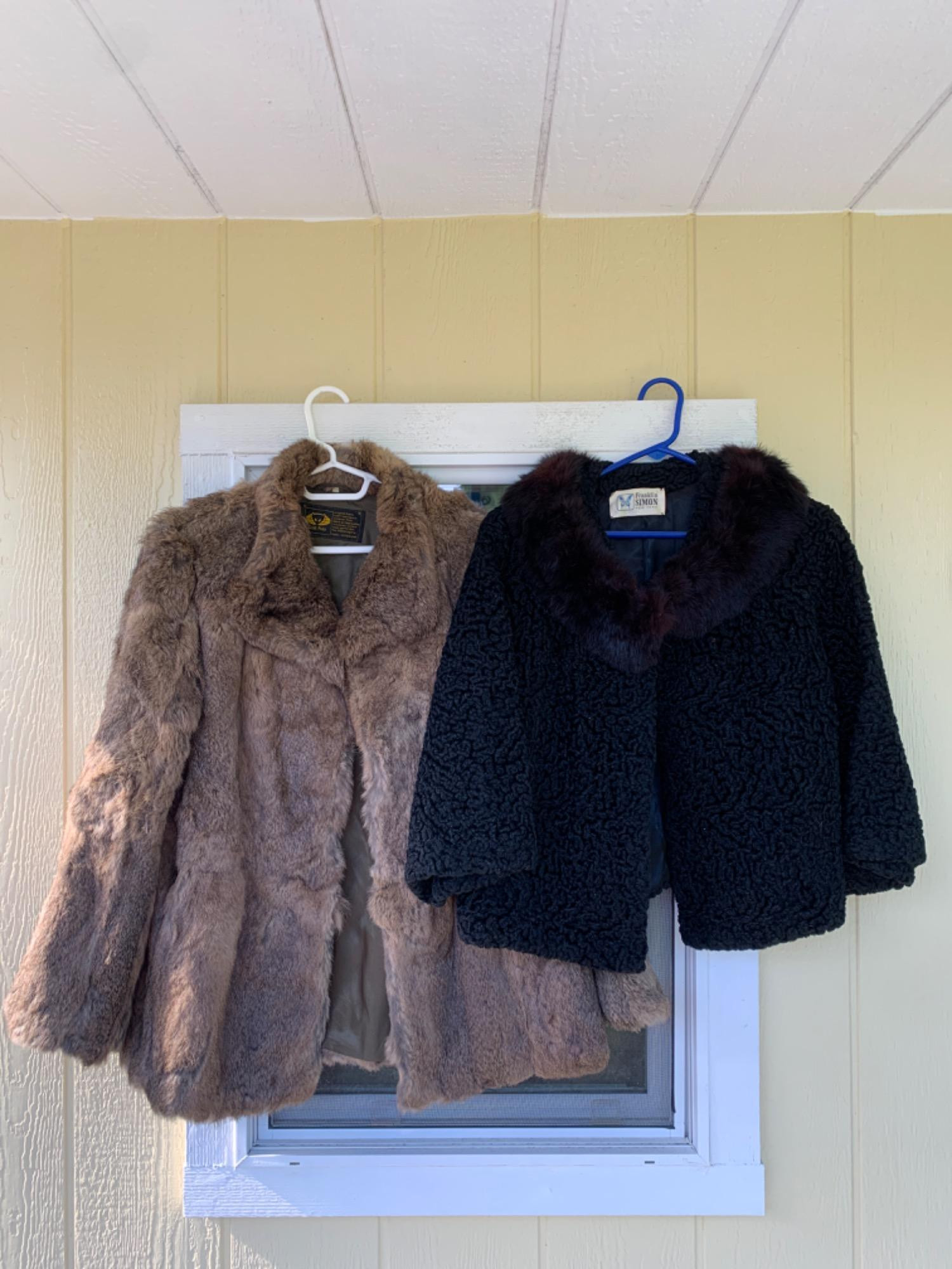 Echt Peltz fur coat is size 44. Possibly rabbit fur. Franklin Simon Black coat, size is unknown. 4-6 possibly. Fur collar type is unknown, black twisted wool.