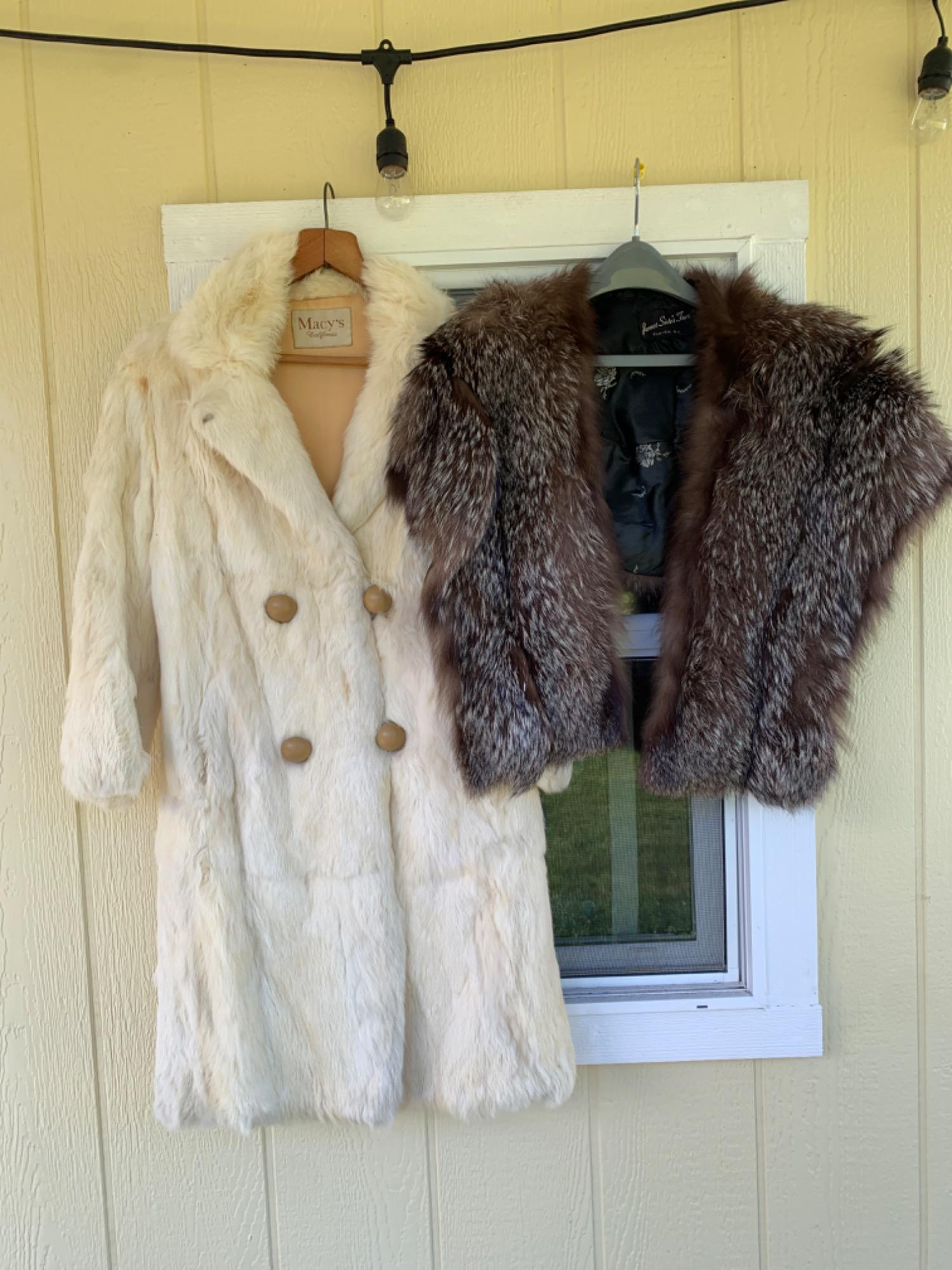 Rabbit fur coat from Macy. Size may be a medium, but not labeled. Heavy weight. James Siote's fur stole with liner. Both are in good condition.
