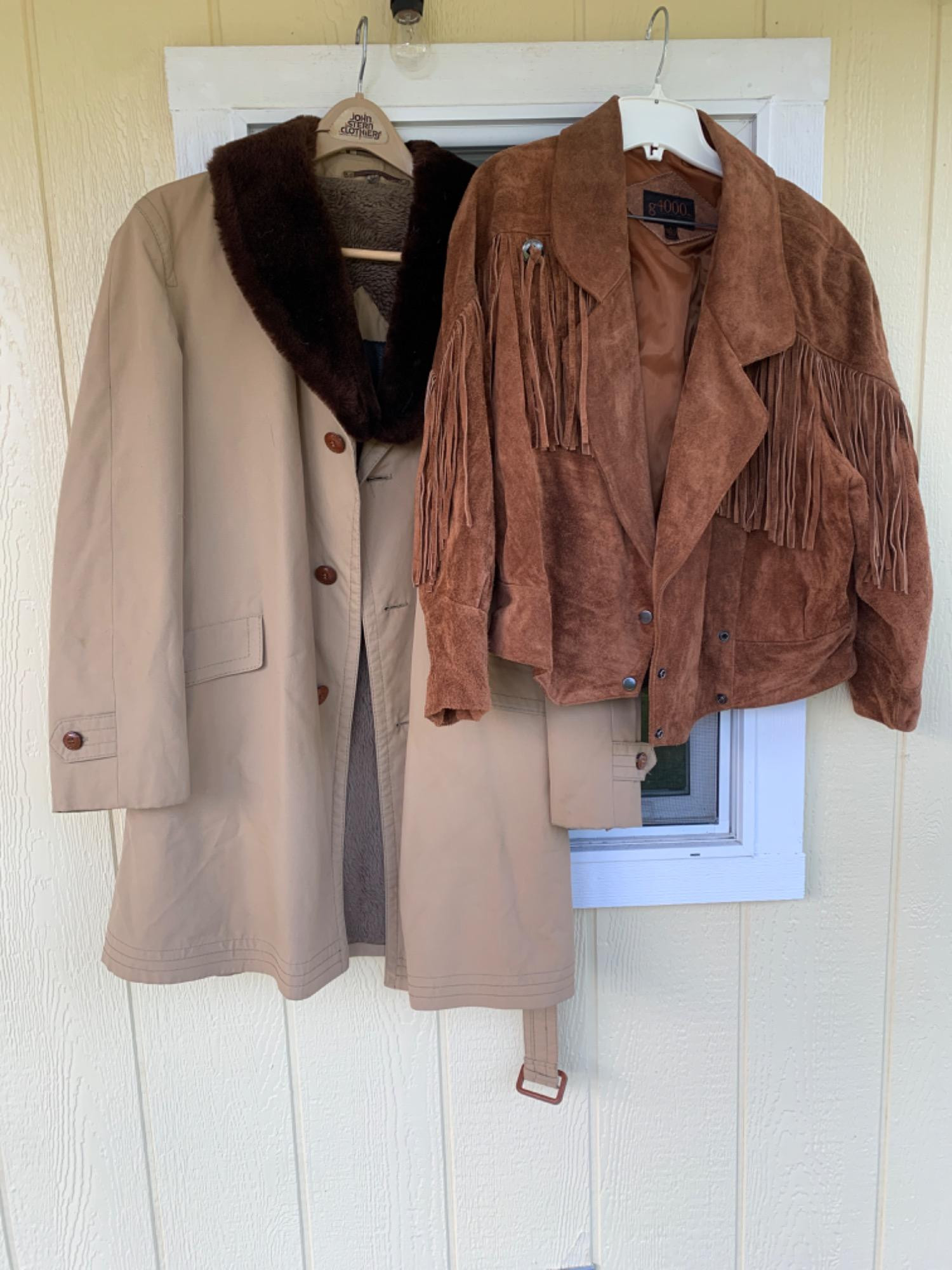 Vintage double breasted suede waist coat is size large. Brand is G4000. Pefri Trevira Fur collared overcoat has a removable collar. Size is possibly medium. Both are in great condition.