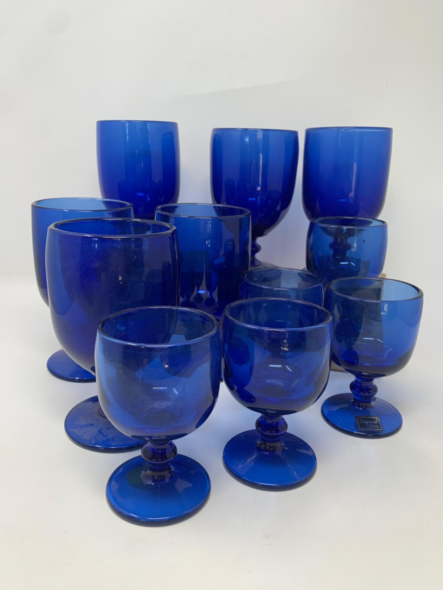 Lenox imperial brand. Great condition. Five smaller blue glass goblets. Six large goblets. Heavy blue glass. Clear and vibrant.