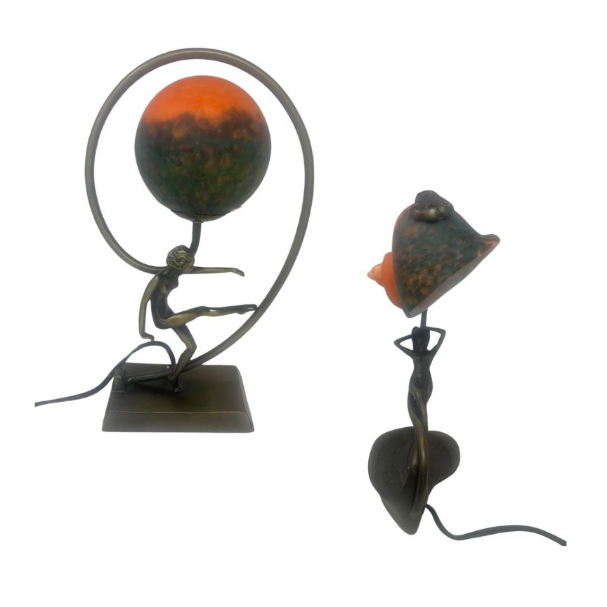 NIB. Orange, green, black, white glass shades. Globe and shell shaped. Bronze sculpture lamps. Feminine figure theme. Round dimensions are 15 inches tall, 9 inches wide, 3.5 inches long.