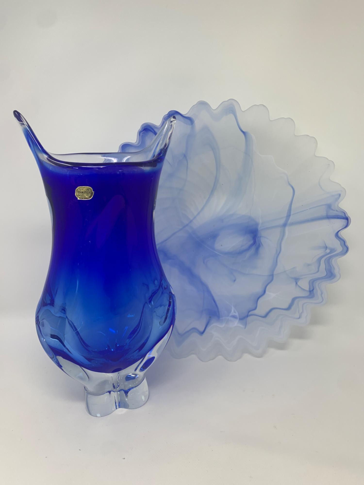 Lot # 87 - Bohemian Glass Blue Vase, and Frosted Blue Bowl