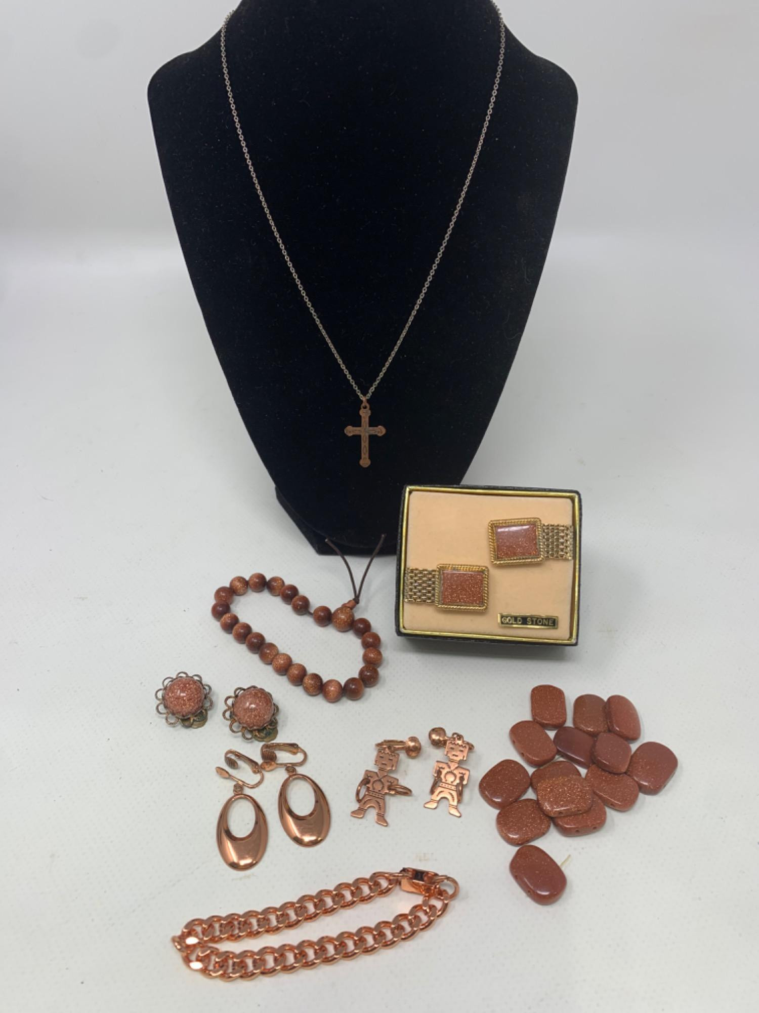 Three sets of clip on copper earrings. Stretchy glass bead bracelet. Copper chain bracelet. Shimmering copper brown beads. Copper crucifix necklace. Two cufflinks in gold and shimmering brown-NIB.
