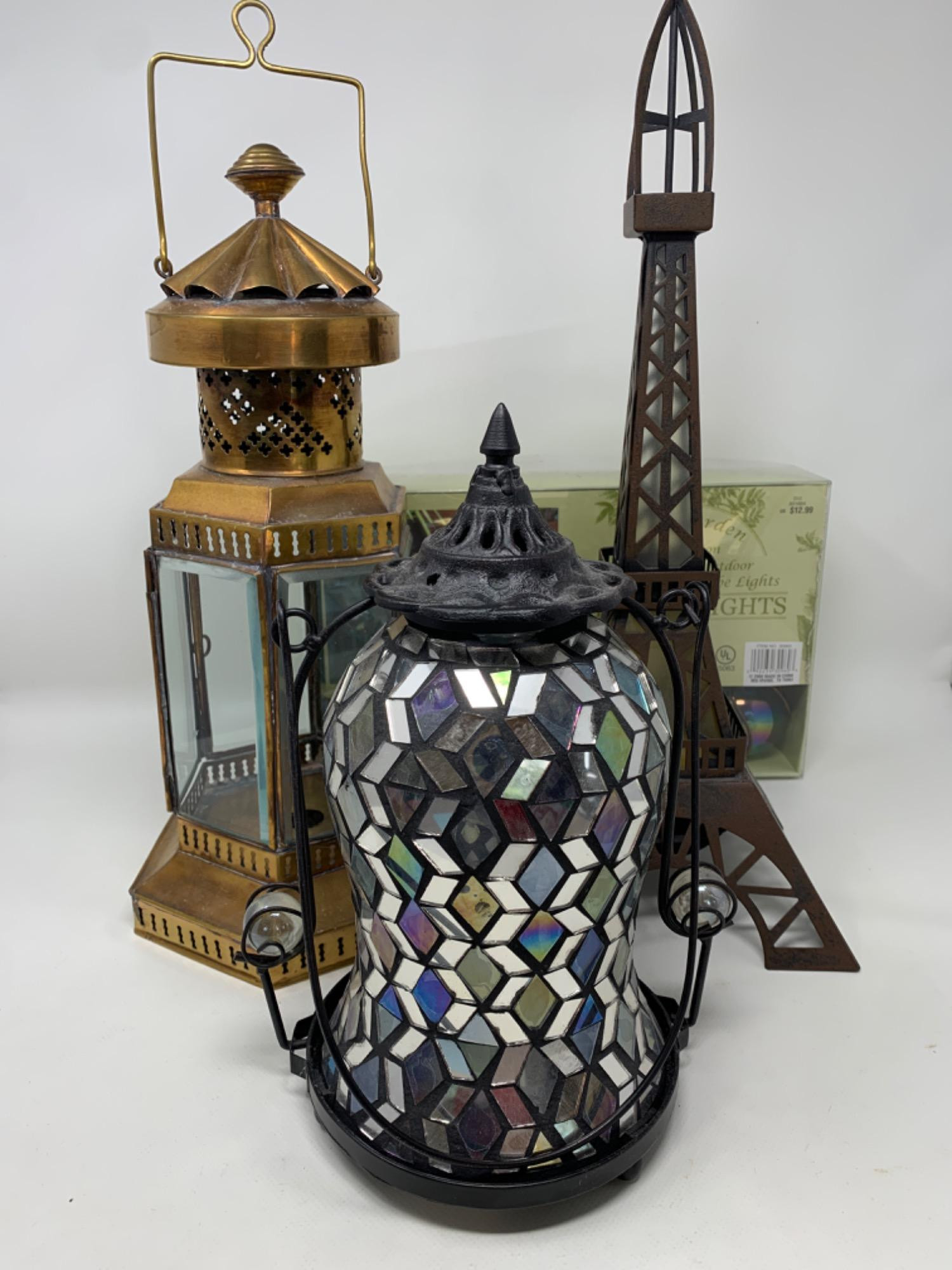 Copper colored brass lamp. Glass mosaic lantern for votives. Metal solar Eiffel Tower. NIB outdoor globe lights.