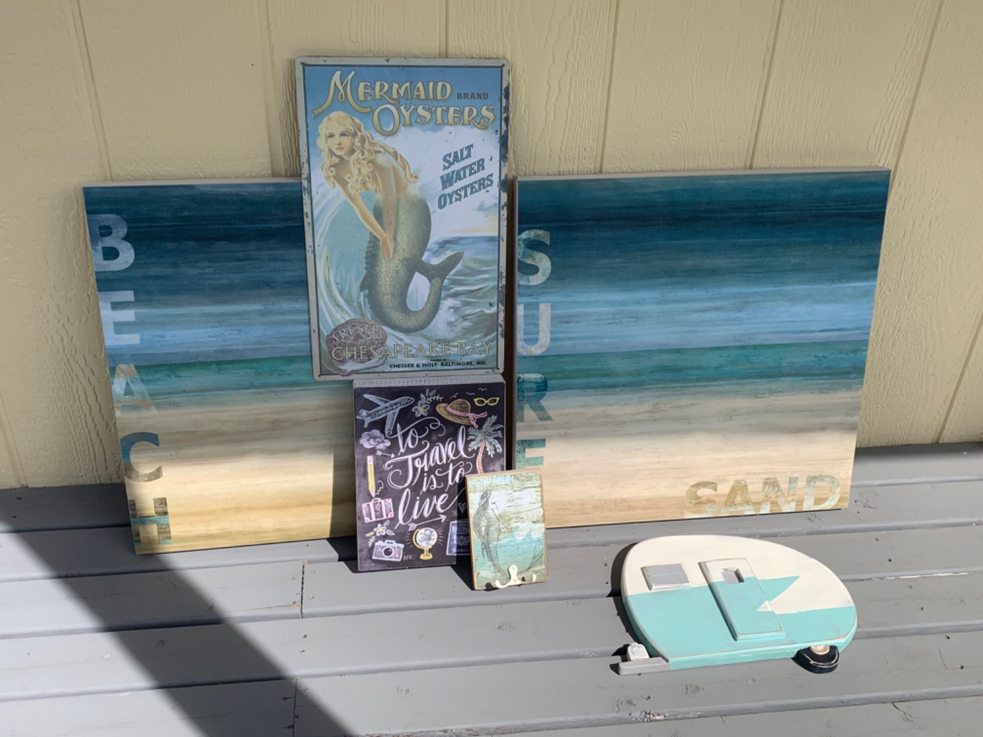 Two matching vinyl beach prints. Wood mermaid plaque with hook. Wood camper and travel art. Metal mermaid and oyster sign. Smaller explore wood block included.