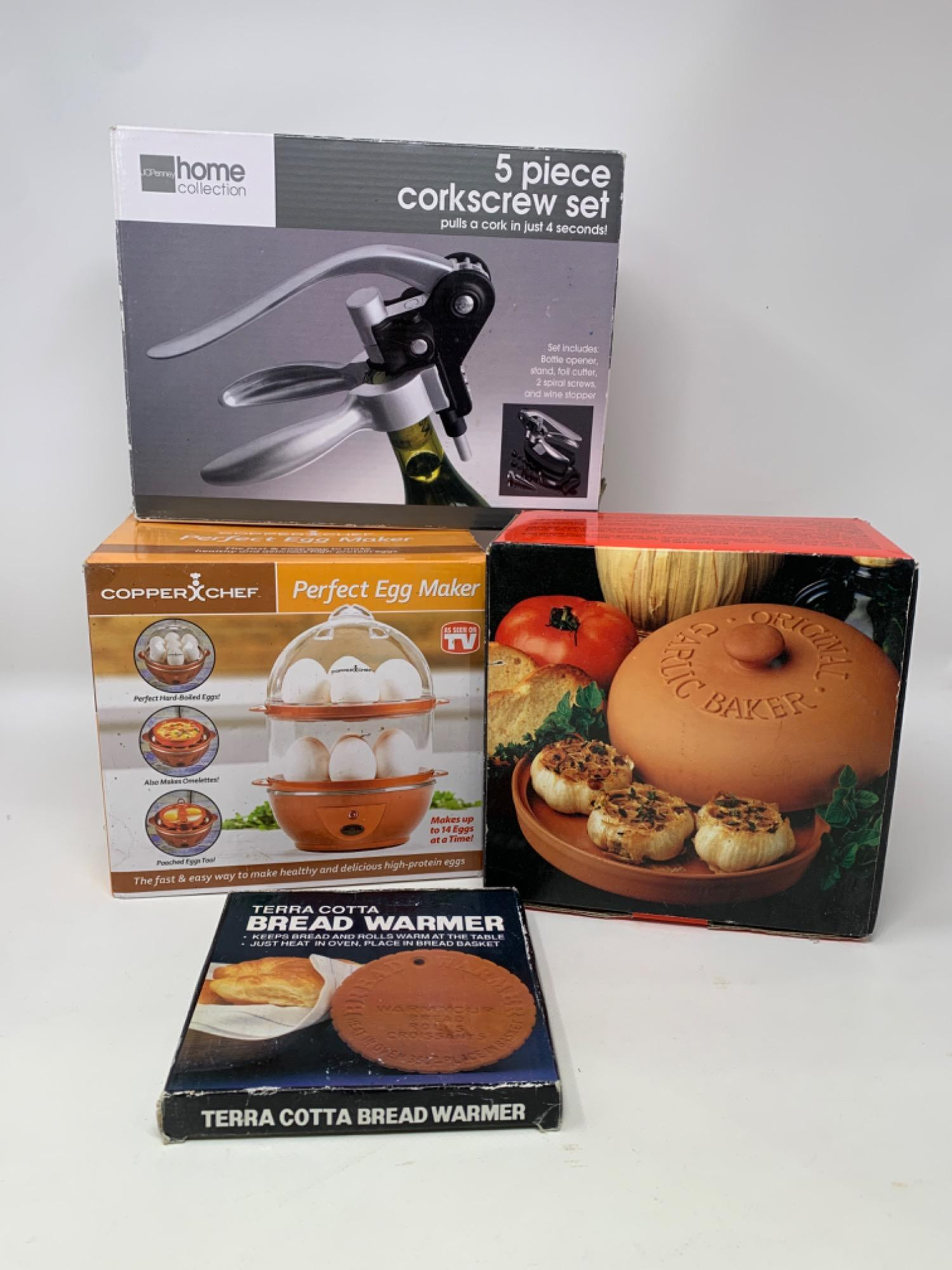 Copper chef perfect egg maker, stone bread warmer. Terracotta Garlic baker. Glazed pan. 3 piece corkscrew set. Missing foil cutter, wine stopper. Most are new inbox.